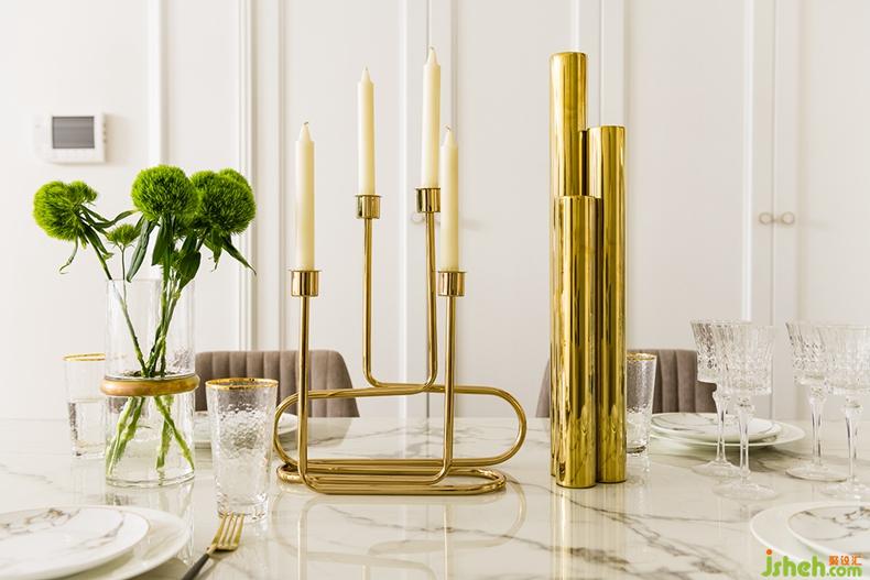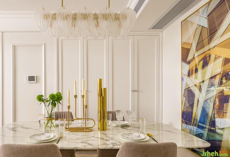叶子状灯饰围合下的金色吊灯,更显低调的奢华和高雅。烛光点亮,晶莹剔透的酒杯碰撞出清脆声响,几何状壁画和谐相融,有着柔中带刚的摩登气息。深圳设计公司
