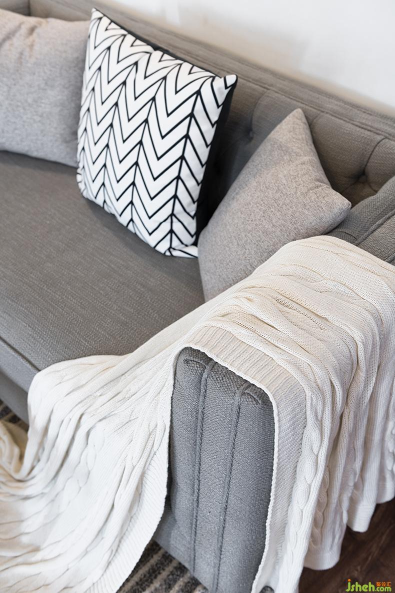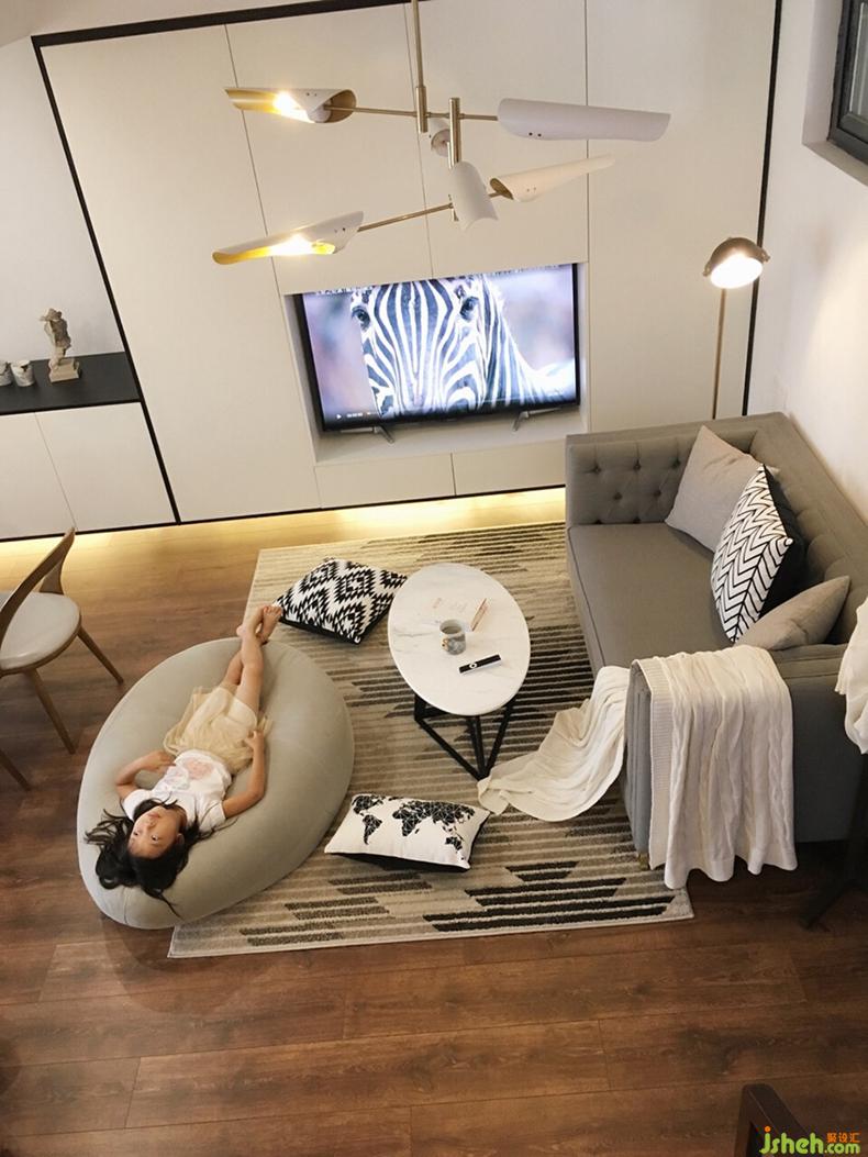 灰白色调和的空间主色系,明亮简约。简单的布艺沙发与一旁的落地灯,搭配几何图形的地毯装饰,低调却很显设计感。室内设计师