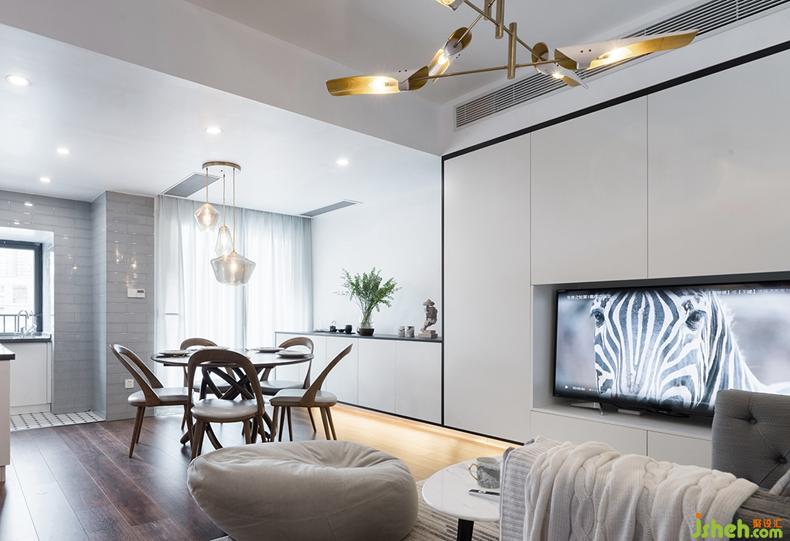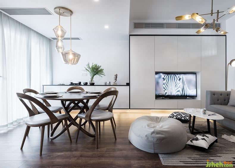 餐厅与客厅间不同灯具的配合营造出空间的层次感,向下的吊灯光源将视觉焦点集中在餐桌上,忙碌一天回到家后,温馨的晚餐时间是难得的欢聚时光。