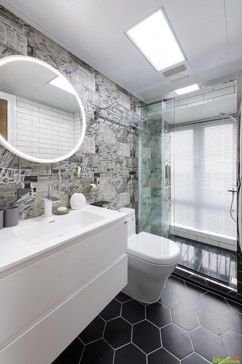 卫浴空间充满了浓浓的艺术气息,不同于中规中矩的瓷砖铺贴,一整面趣味性十足的墙面,营造出活跃的小空间氛围。室内设计师