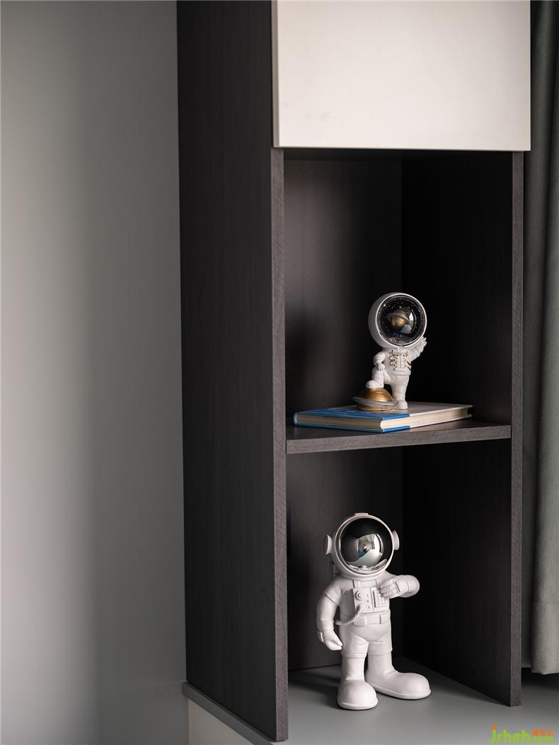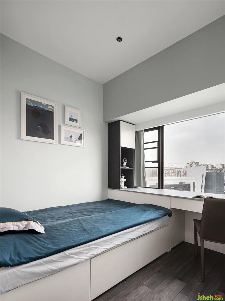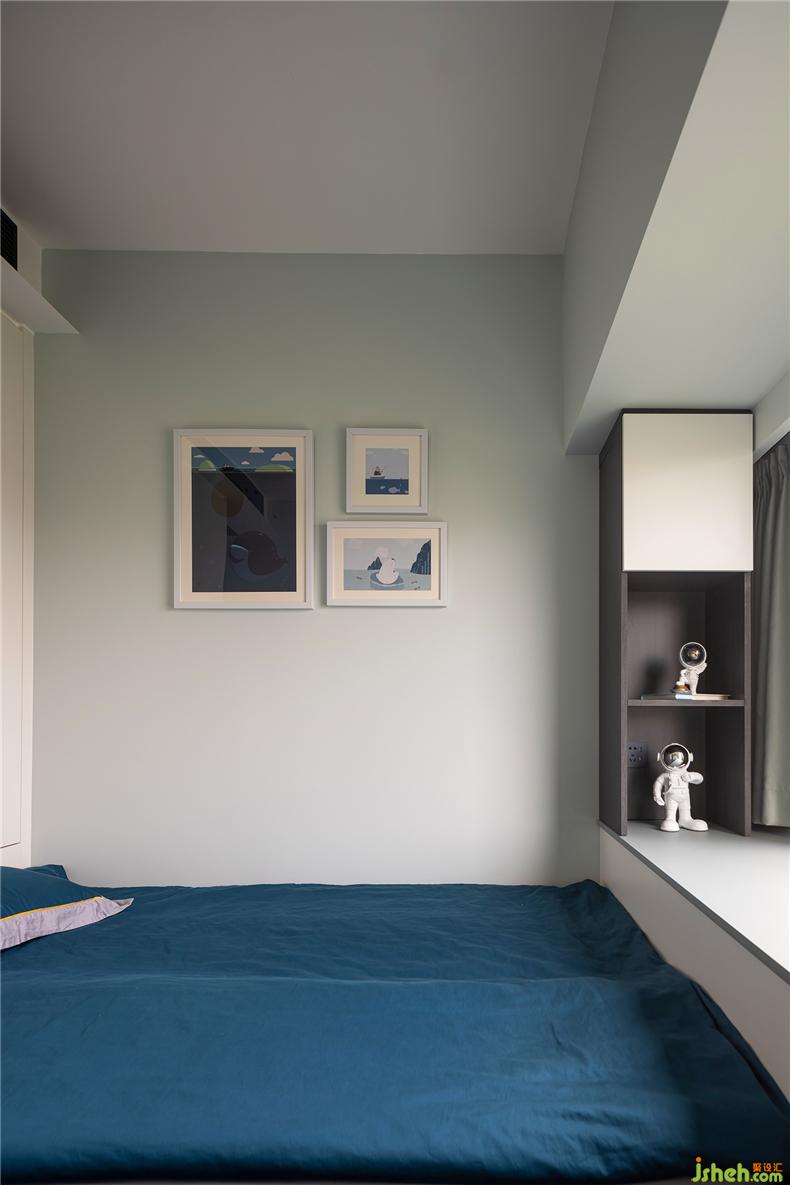 次卧的窗台设计将室外风景纳入成画,与蔚蓝色床品、宇航员手办、海洋系列的画作形成呼应,室内设计师一动一静,美好相随,看似渺小但又天真可爱