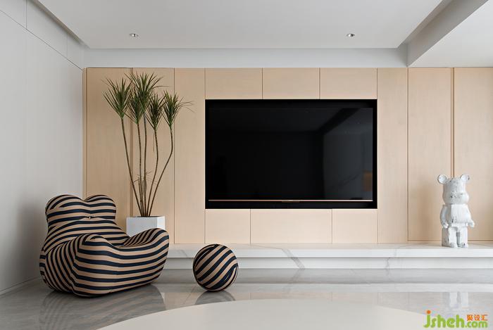 电视背景墙一整面的暗藏收纳柜,大大满足了收纳需求。深圳家装设计原木色的柜门与餐厅呼应,让空间温馨而舒适。