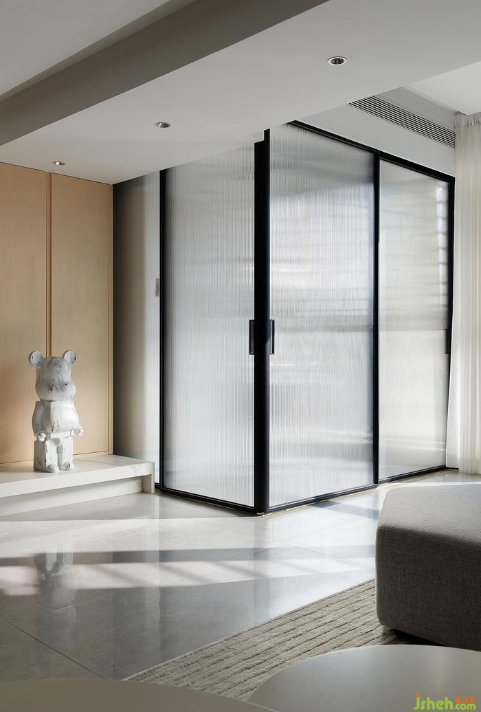 我们把阳台分为两个功能来使用,一是满足家人需洗衣与晾晒的功能,二是家人的喝茶区域。深圳家装设计在这个家里洗衣房的区域,我们用可开可合的长虹玻璃来与客厅做一个隔断,平时晾晒衣物的时候关上玻璃门,也不会显得客厅空间凌乱。