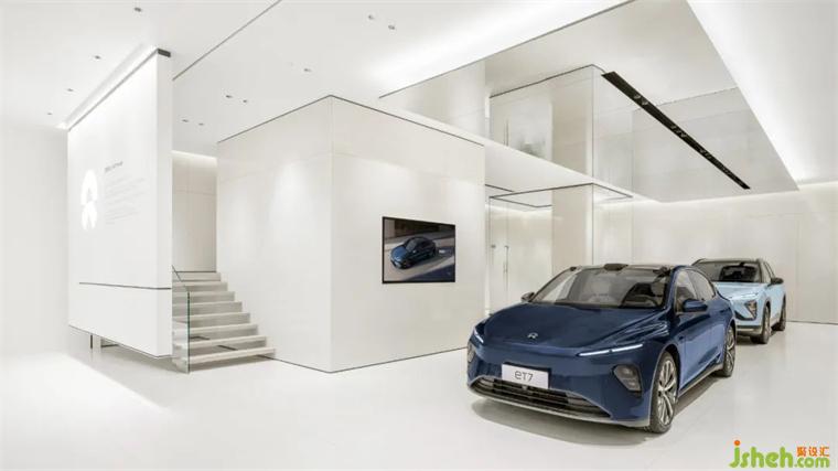银白色现代质感材料奠定洗练的基调,空间质感与汽车同频,也让科技感满满的蔚来汽车形象脱颖而出,干净飒爽,高级感十足。