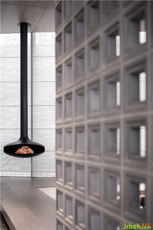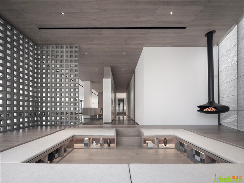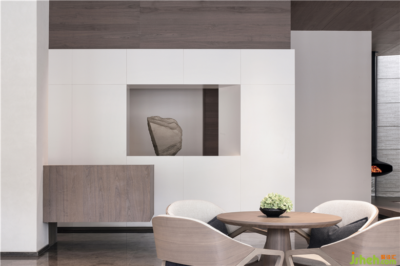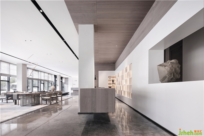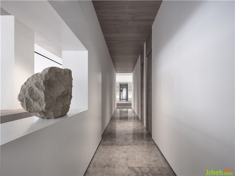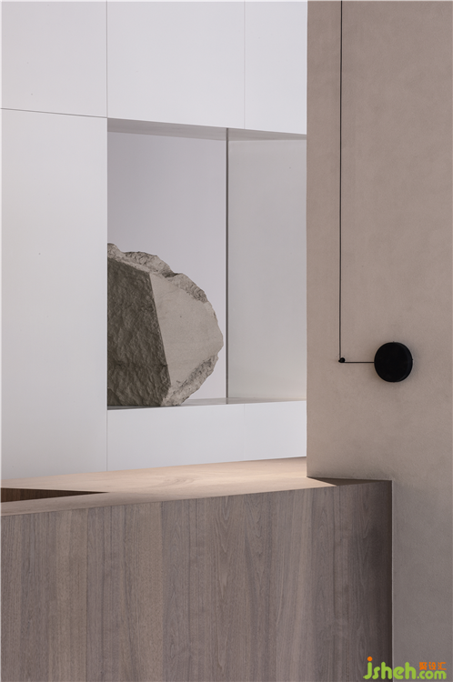 纯粹的白色块面与粗犷的原石雕刻,穿插出一种东方园林屏风的“漏景”韵味。