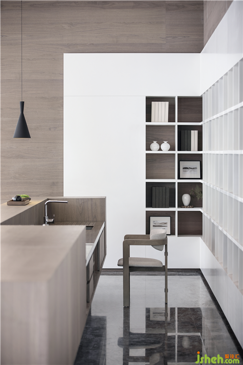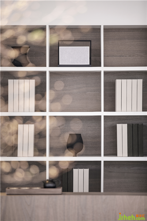 细节的诠释,是恰到好处的精致。诗书、墨壶、画框静默于书架盒子,文雅之风在此荡漾。