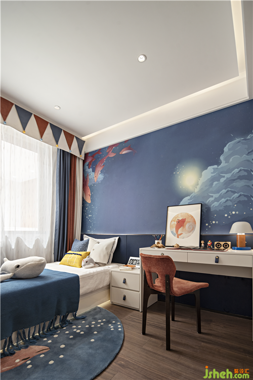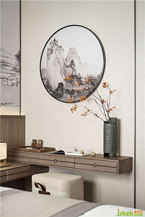 山川缥缈的金丝绢画成为视觉焦点,金属的质感与木纹的温润进行区分,滨州样板房设计在光的映衬下穿插流动的优雅,诉说生活的品位。