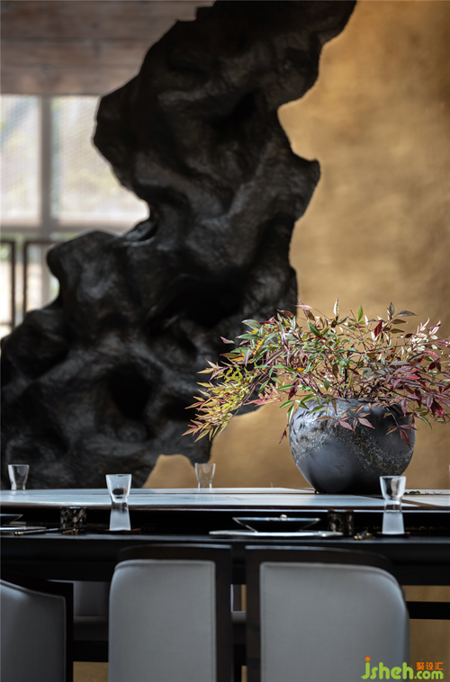 一墙拙石、墨陶竹枝、一盏茶杯,拙朴的传统美感于细节中得到当代美学的传承,文人诗意的浪漫跃然而出。