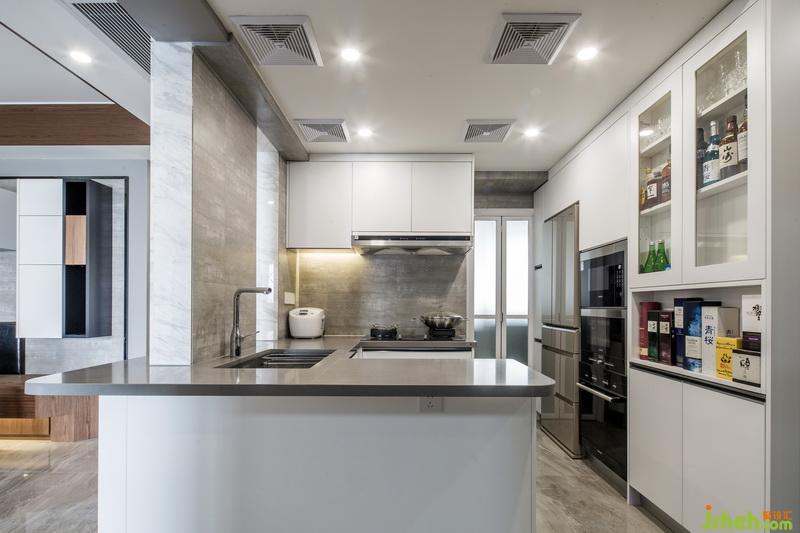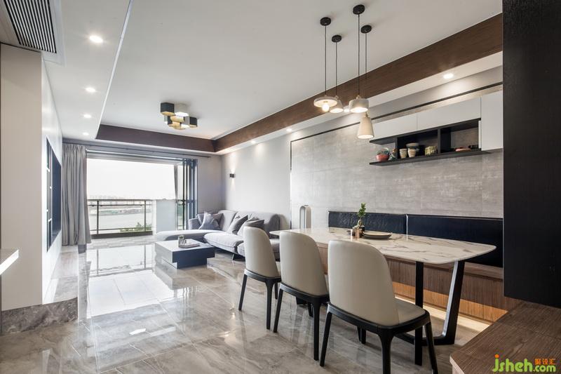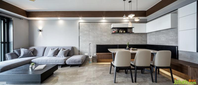 在空间立面设计上,造型做到一减再减的设计手法,让空间变大,家具尽量使用实木家具以保证绿色环保,电视墙面是满墙的柜体,却并没有造成视觉的拥堵,因为与橱柜的台面处理成同一面,巧妙的弱化了存在感,色彩上采用大面积色块,灰色配合了高质感的家具材质,灯光使用暖黄光,符合业主的品味也不失一家四口的和谐温馨。