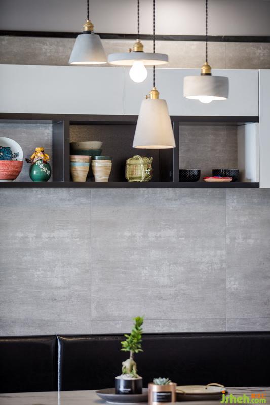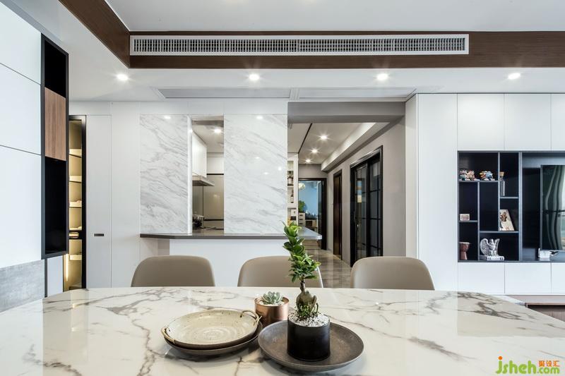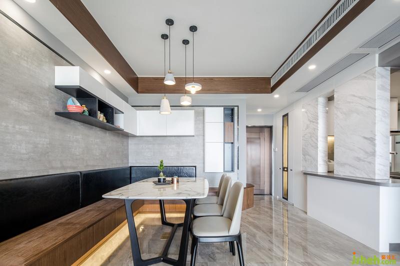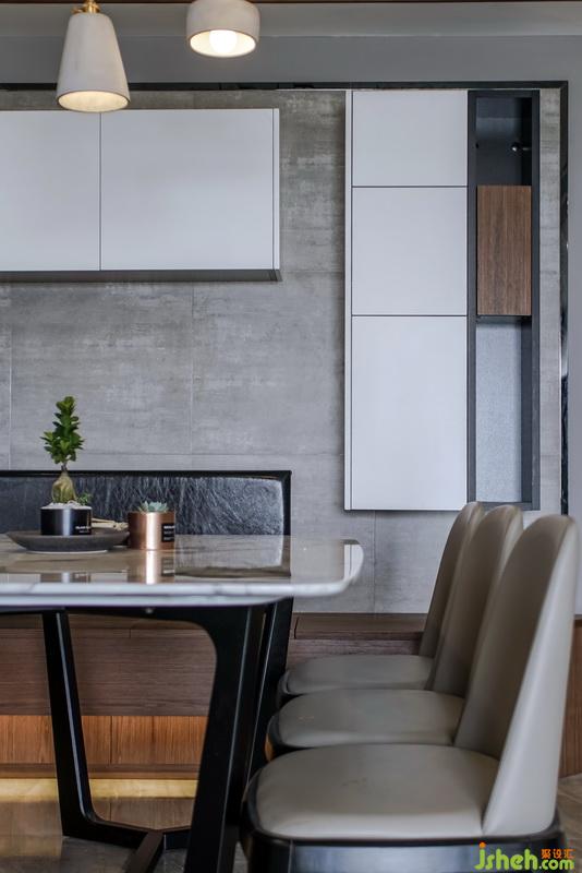 考虑到偶尔会大家庭聚会,所以在餐厅的设计,我采用的是组装柜体卡座,餐厅是一个,你给它很多细节它就会还你更多功能的地方,卡座采用柜体结构,可以储物和储存小孩玩具,平时可以当作小孩玩具娱乐区,卡座的延伸与玄关的换鞋椅成为一体,同时与半开放式厨房台面形成一个新的动线方向,避免了入户门直接对冲阳台推拉门的风水问题,也增加了厨房的实用功能,橱柜斜形台面,主要提供放置业主的随手物件,例如钥匙,钱包,台面上的两面墙体,一是具有装饰性,同时也能很好的遮挡日后厨房使用起来的一个凌乱现场,中间的留空,可提供女主人与客厅家庭成员的一个沟通,也能起到传菜的功能。