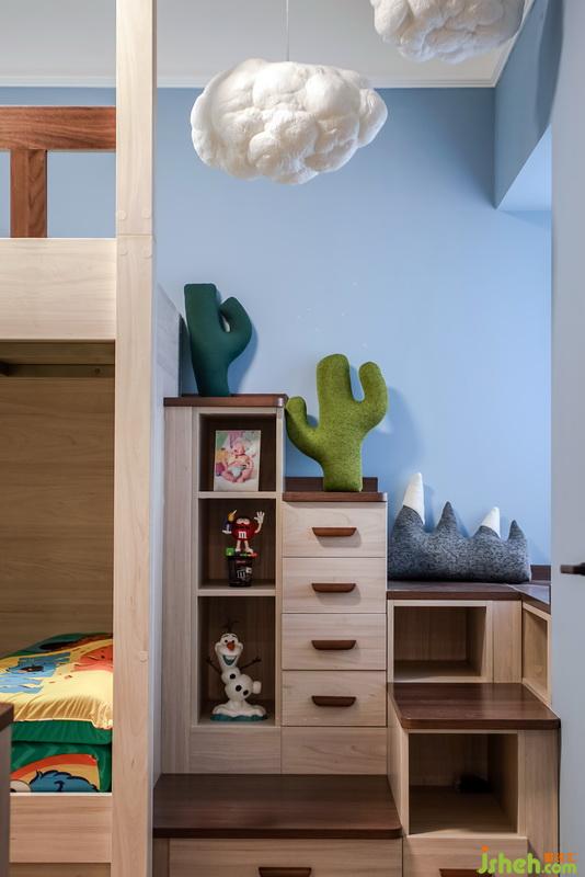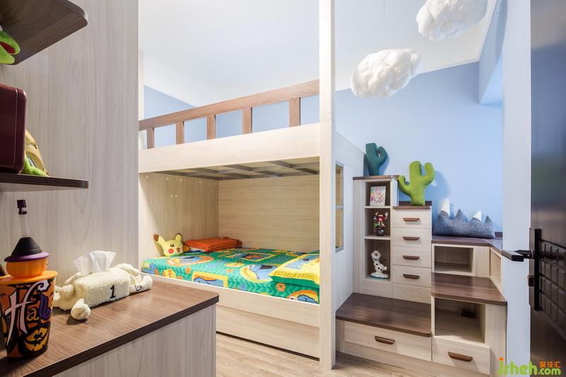 小孩房为节省空间,采用了上下铺设计,利用了飘窗台做了个异性转角台阶,增加了空间的趣味性。
