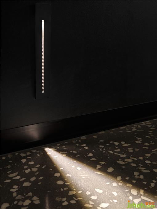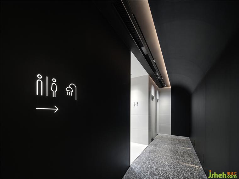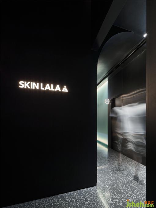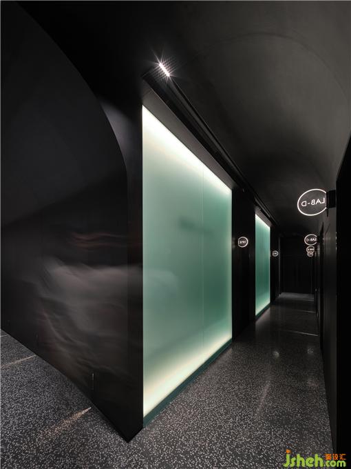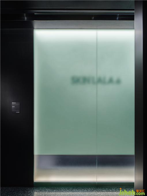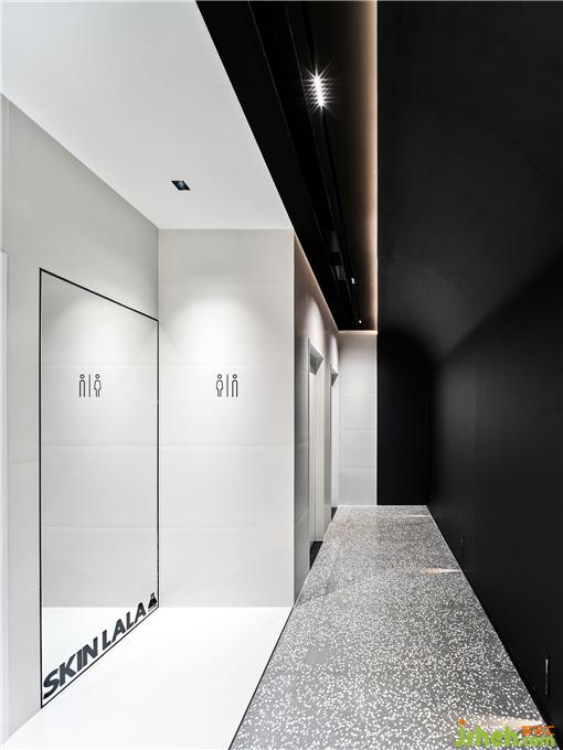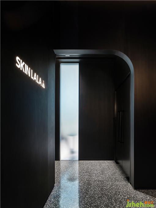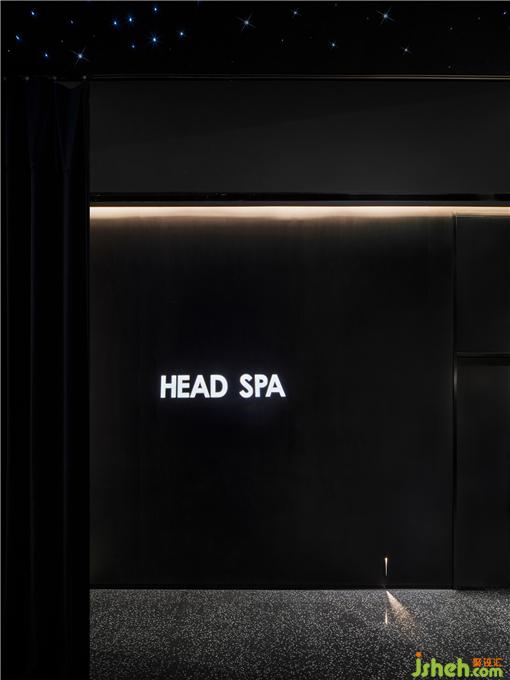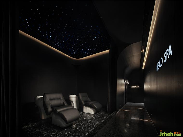 面部注氧、面部普拉提、头皮护理、及身体SPA,都需要更加舒适放松的光线。顾客从前厅进入到客区,瞬间会安静下来,来到一个静谧的黑色空间。头皮护理区闪烁着蓝色的星空顶,墙面辅以投影,SPA设计在黑色幕布帘拉上的一刻具有剧场般的感受。照明在这个空间极为克制,用地脚灯指引路线。所有的设备被整齐的收纳在顶部的黑色不锈钢槽中,弧形的顶面和玉砂玻璃打破窄长走廊的单调感。