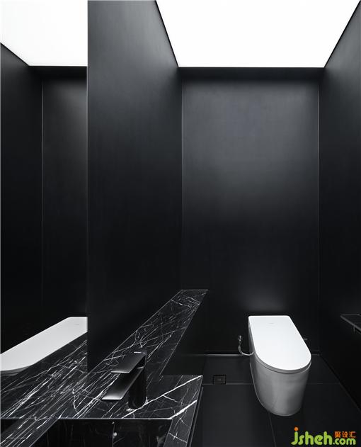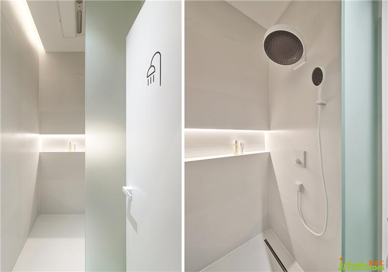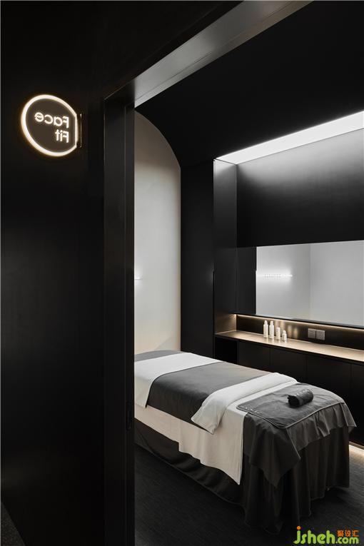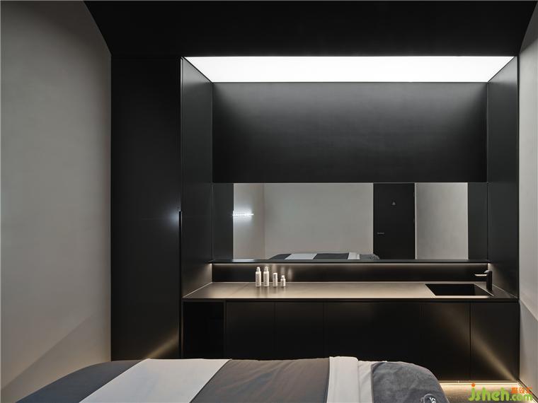 公共卫浴的区域,利用黑白两色视觉上将空间一分为二,增大视觉宽度。SPA设计定制LOGO全身镜方便顾客自拍的同时实现品牌传播。所有洁具均采用德国高端品牌,在每个细节给顾客提供最好的体验。