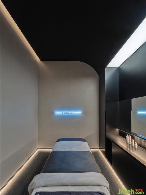 化妆间位于客区左侧,和所有空间一样,吾觉设计团队注重每一个细节,将不必要的设备,风口等全部巧妙的藏在了隐形处,保证每一个小空间的纯粹。SPA设计拱形元素在这个空间依然延续,营造一个有趣味的化妆室。柔和的光环境提供了拍照的磨皮效果。