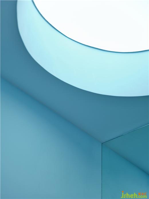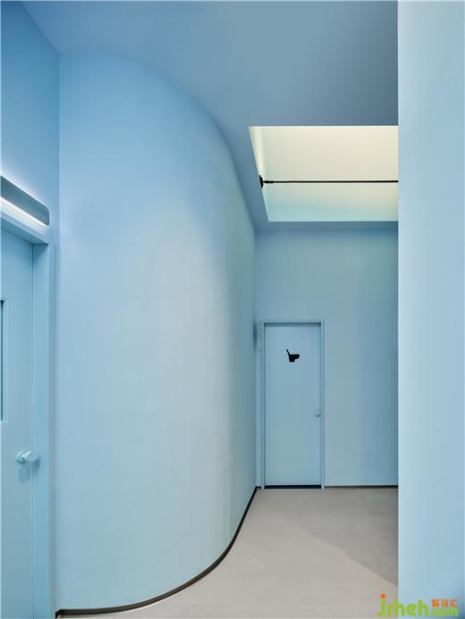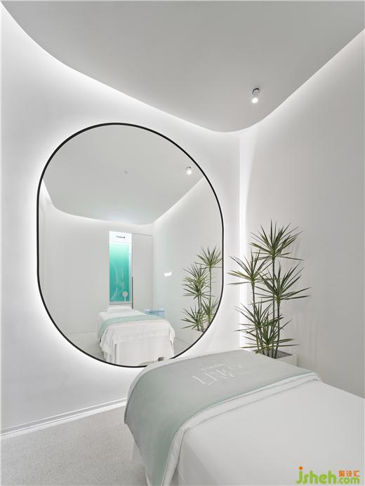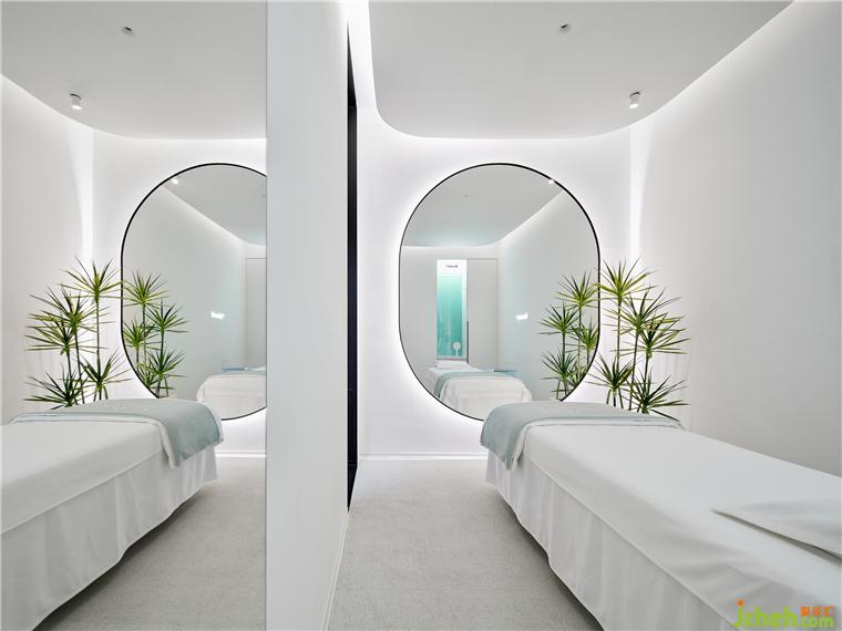 单人护理间格局呈矩形,顶部的弧形弱化空间棱角。纯净的空间点缀蓝绿色渐变玻璃立显清透,镜面从视觉上扩大空间。每个房间都配有香薰,疗肤中心设计并隐藏在衣柜内,只留一个释放香味的小孔。衣柜内部和小型梳妆台提供顾客所需的衣物存放、梳子皮筋等配套用品。