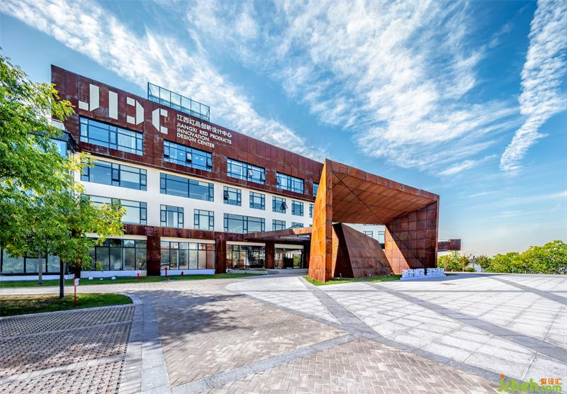 JIDC整体建筑以“简约工业风”为主,符合国际化、现代化的设计理念,以创新、开拓、发展、不复古的手法改造。细节处保留原始建筑风格翻新,采用沉稳简约的建筑造型、砖红色的工业风外墙、开放式的外围设计。中心建筑外部以红、白两色为主色调,做旧的红色铁皮外墙包裹着建筑四面,内部以灰、白为主色调,尽显高端气质。整体建筑用不同角度的方形体块相互穿插组成,以钢板、玻璃、白色外墙漆为立面主要材料。