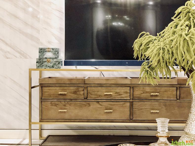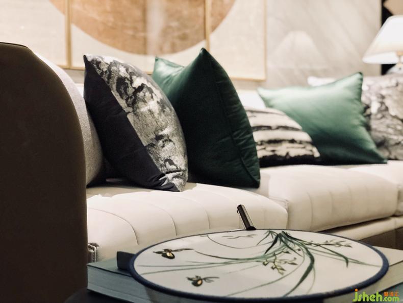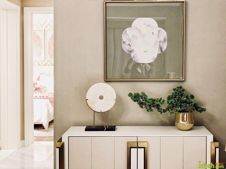 客厅总体雅致,但目光细细流转,流萤画扇、绿植、理石小柜、树桩摆件......它们的组合使得意象不仅是停留在意象,“境”生于象外,悠扬深远的意境便衍生在了这幅画里。