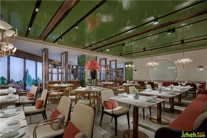 过狭长的甬道,步入餐厅的瞬间视线豁然打开,别有洞天。饱和、浓郁的绿色红色扑面而来,餐厅设计与陈设饰品的搭配使人眼前一亮,整个空间充满活力,生机盎然。绿色的烤漆钢板天花突破了在传统湘菜餐厅中固有的色彩认知,定制的折扇型的吊灯打破了空间的沉闷,成为视觉中心。