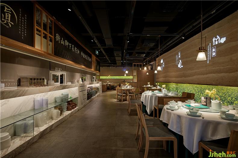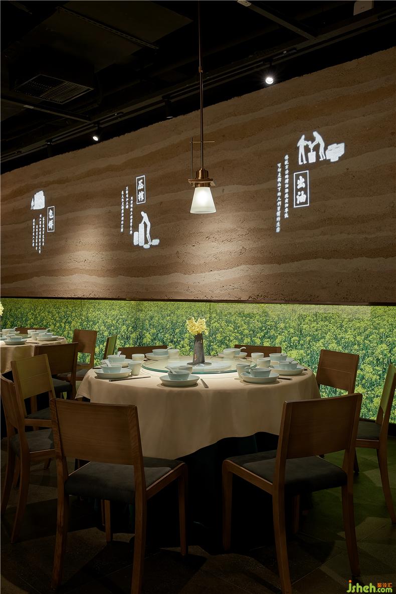 餐厅夯土墙上的投影重现衡山乡下的榨油场景,与背景墙、食材介绍相映成趣。餐厅设计