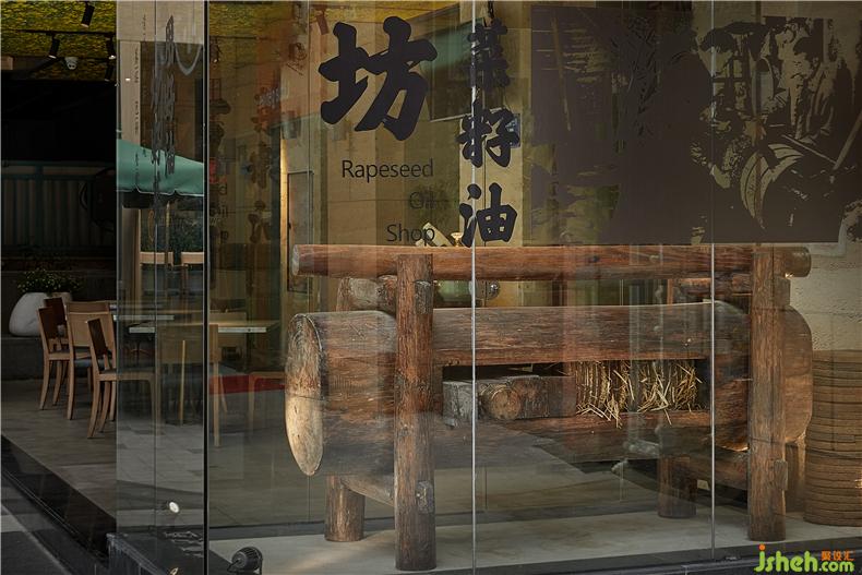 初至「遇见湘」祈福店,一片金灿灿的油菜花海充满眼帘并延伸室内,门前花海下放置着一具手工木质古法榨油机,两侧整齐地堆叠着菜籽油饼,吸睛的同时力图传递出匠心、传承的理念,餐厅设计也通过这两个代表性的符号传递出定位的诉求:衡山脚下菜籽油,炒出地道湖南味。