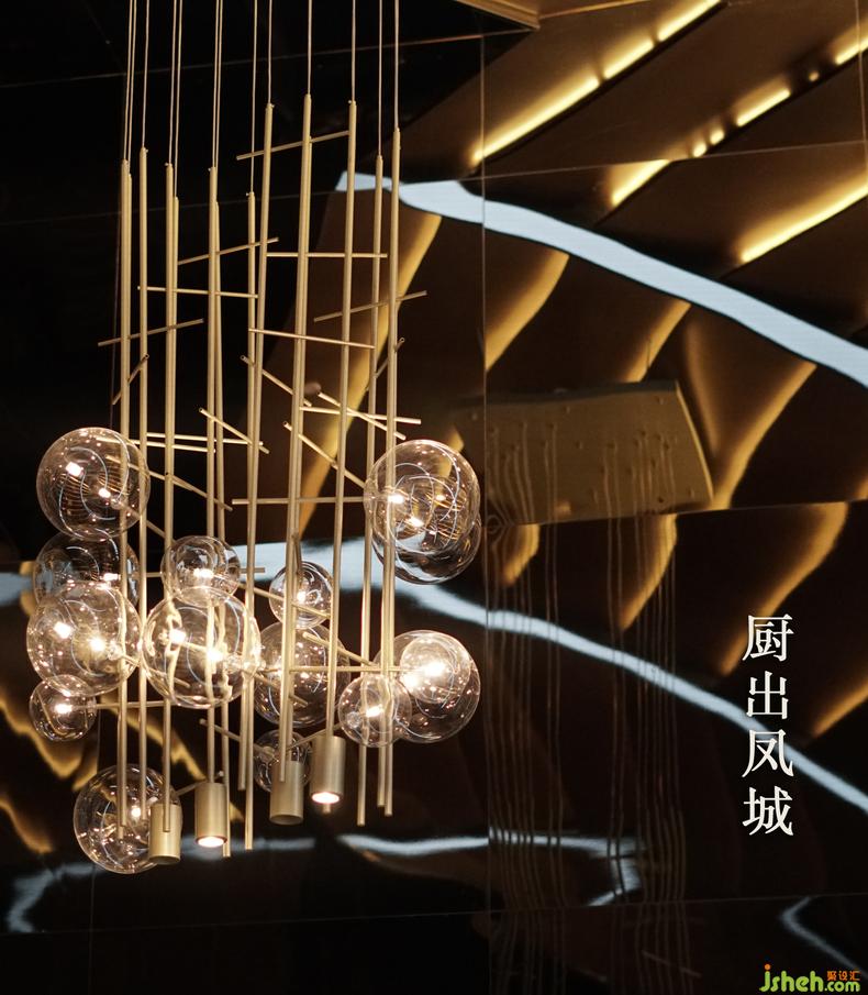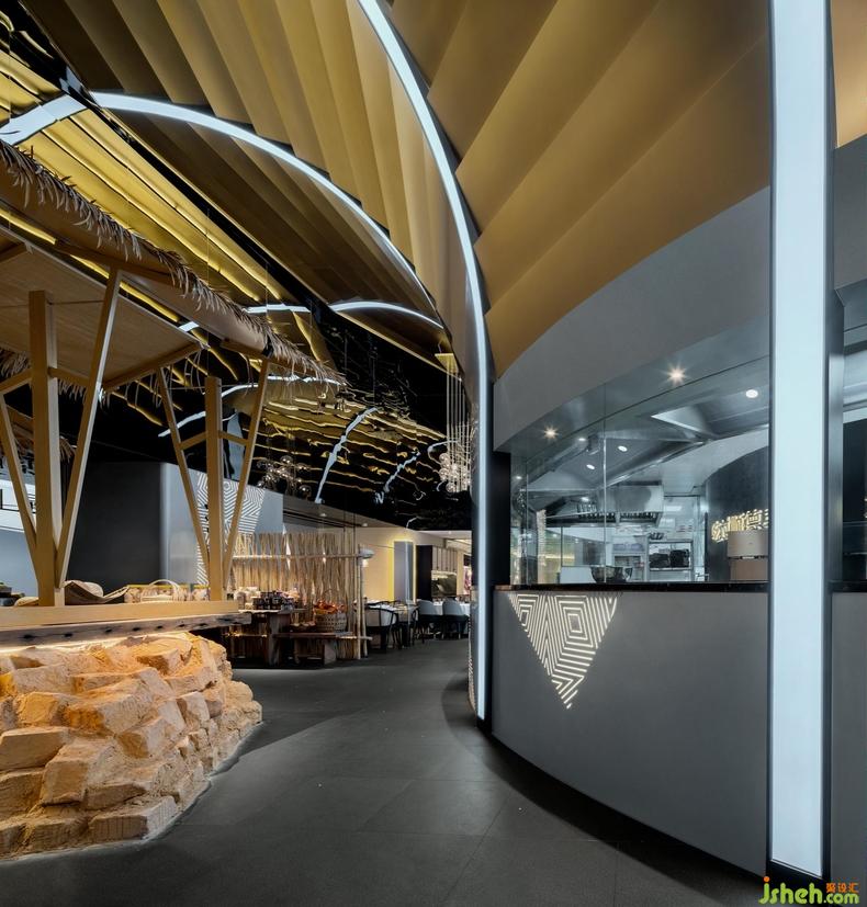 有山设计与策划公司着力打造“厨师的道场”,餐厅设计力图将明档成为厨师表演厨艺的舞台。餐厅的入口处必须是食客第一眼视觉所在,一个巨型的直通天花的明档厨房矗立而起,用金属铝板层层堆叠而上,利用空间层高的优势延展开去,造型灵感来自于厨师的高帽,又似维也纳歌剧院的金色舞台。