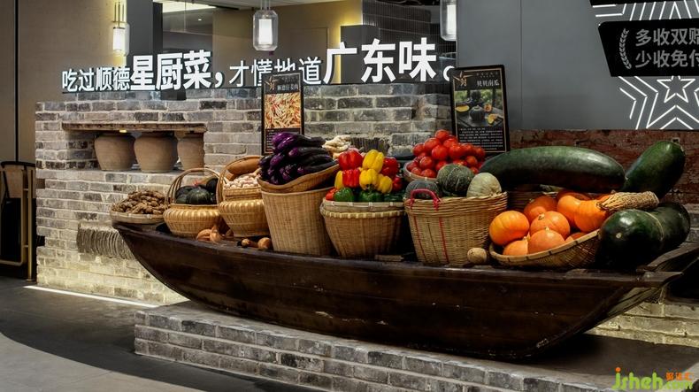 顺德菜讲究原汁原味,注重清美鲜甜,追求食材本味,食出真味是顺德人的一贯追求。设计师特地从民间搜寻旧船,船上陈列着应季的瓜果蔬菜。顺德水乡亦是鱼米之乡,入口右侧摆放着定制大木桶,餐厅设计里面饲养着鲜活的白鳝、小笋壳鱼等顺德特色鱼产;