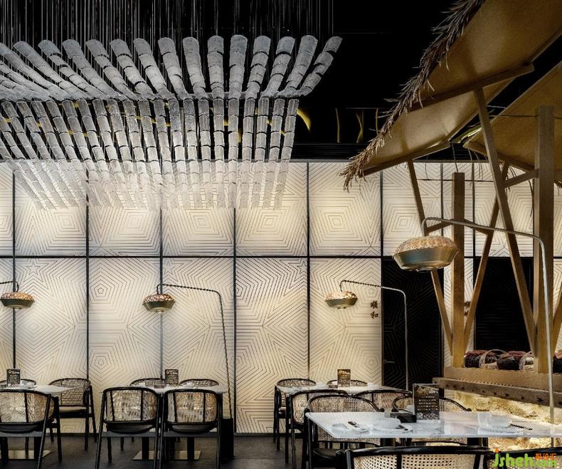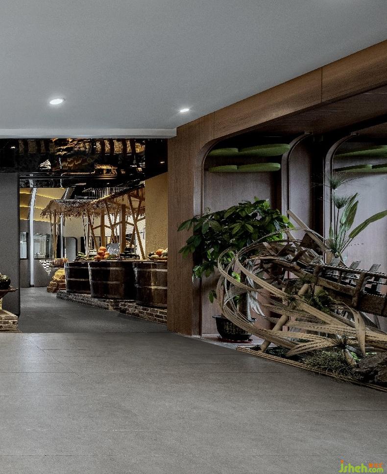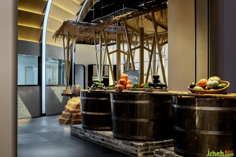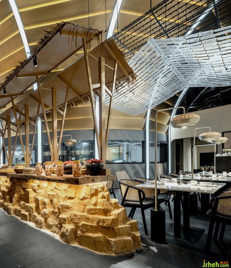 区域的隔断采用夯土砖结合茅草屋的形式,餐厅设计既增加了空间就餐的隐私性,又能作为食材的展示台,上面陈列着顺德家家必备的佐料食材,如嫩子姜、腊肉等等。