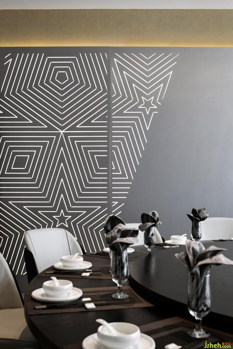 采用激光铝板雕刻工艺,搭配墙面仿旧的肌理漆涂层,餐厅设计营造出现代雅致的就餐氛围。