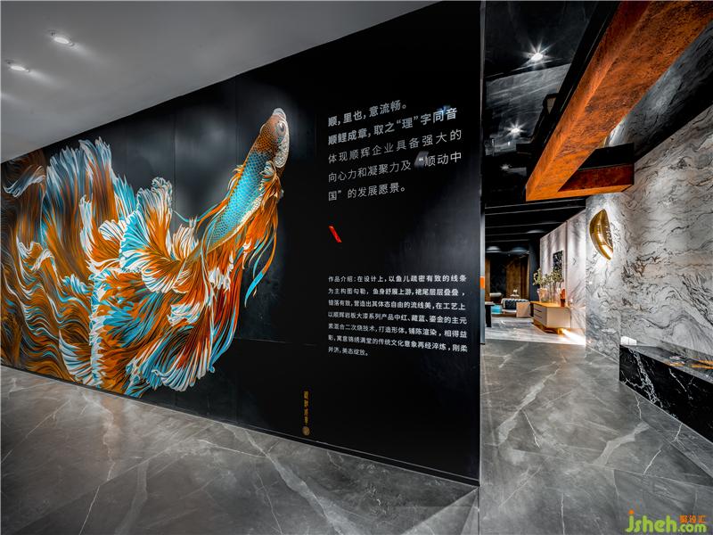 中国传统文化是根,古为今用,创新再造,方能一展经典之美。入展厅,一尾色彩斑斓的鲤鱼栩栩如生,鱼身舒展上游,裙尾层层叠叠,体态流线、轻盈。这是顺辉岩板联手艺术家陈健珊创作的岩板壁画“顺鲤成章”。它纳入铜凿剪纸的非遗文化技法,在大漆系列岩板的基础上,采用炫彩釉复烧。一侧置有同样来自佛山民间艺术社创作的竹编船只装置,灵动自然,呼应在地文化深圳装修设计。
