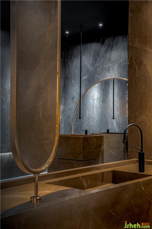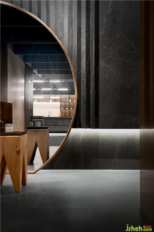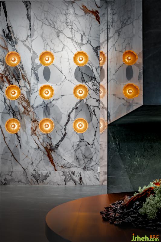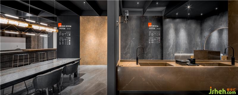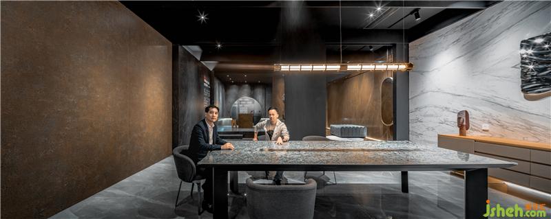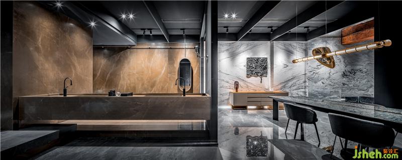 以电影中的长镜头手法解构空间,形塑明晰动线——不折返,一“镜”到底。墙及地面运用不同岩板,区隔出客厅、餐厅、厨房、卫浴、选材区、洽谈区的不同场域。客厅的对纹电动门、客餐区的小园景、餐卫的色调衔接……力求介入设计,将场景转换消弭于无形,让观者沉浸式地体验其中。