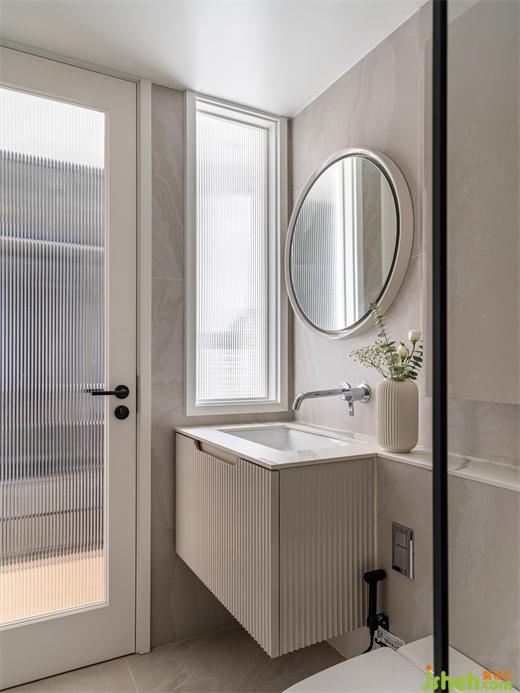 卫生间结构调整后,原窗户在衣帽间里,为了增加采光在卫生间门边设计了一个内窗,与卫生间门呼应
