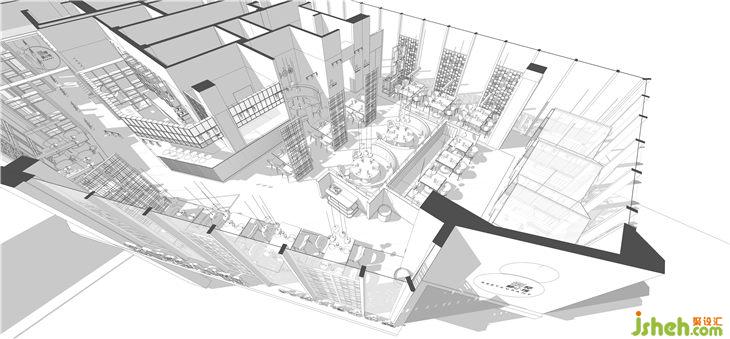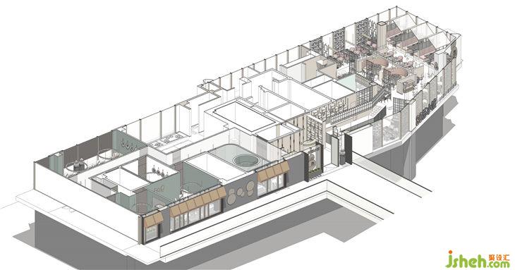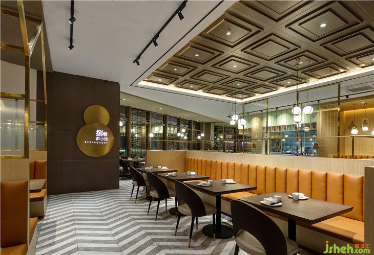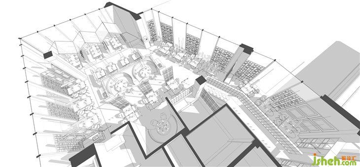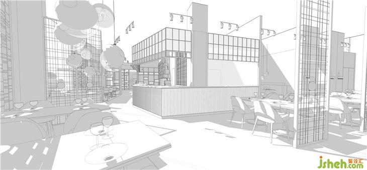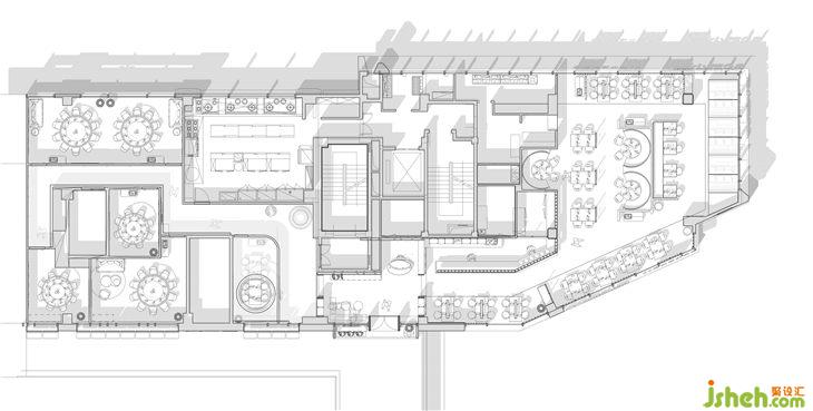 原图建筑中间的核心筒处在整个餐厅最核心的中间位置。很尴尬的把空间均分为二。布局上利用厨房和吧台吧畸形的角落空间利用起来。化零为整。以吧台为纽带,把厨房和就餐区的功能分开,把服务联系在一起。