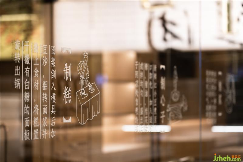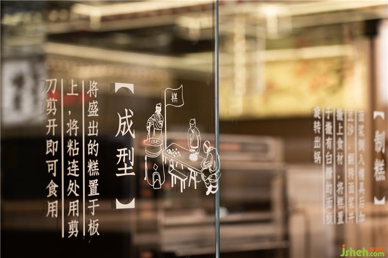 黄天源作为2009年江苏省首批“非物质文化遗产”传统糕团制作技艺的品牌,理应在其空间场域来传承其制糕工艺。“非遗展示区”的玻璃面上,一道道制糕工艺,跃然于空间,让其看不见的工艺得以重现传承。