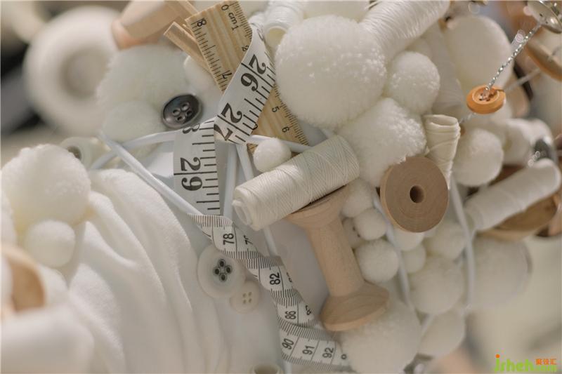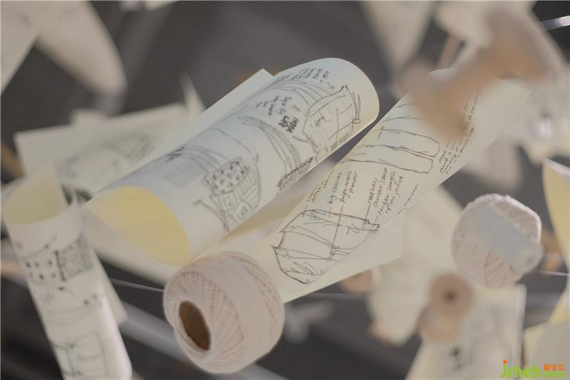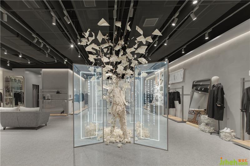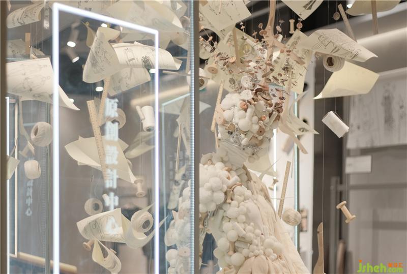 在入口处的艺术装置中,我们将卷尺、针线、剪刀、纸样等做衣服的道具融入其中,重塑工作室场景传达设计美学。身上堆满零件的人偶,走出堆满废弃设计图纸,头顶漫天飞舞的灵感设计手稿,是服装设计师尝试打破层层壁垒,努力迈出的通往时尚之门的剪影。是他们在经历了思维的撞击、融合后,苏州店铺设计以不同以往的思维方式建构自我风格的全过程。