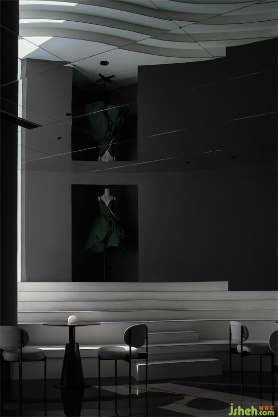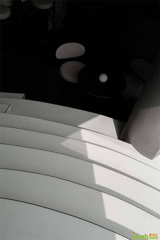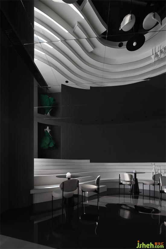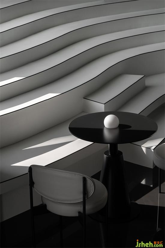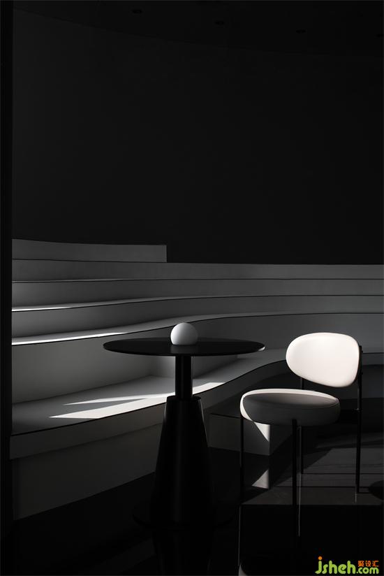 作为秀场的主题色,黑与白是永咖啡&酒吧复合空间设计不过时的经典,结合当代艺术思维进行空间的重塑。深与浅的色块将冰山与水面区分,浅色的休息区是冰山的层层递进,深色镜面组成的地面成为深不可测的湖泊,形成了视觉上的空间对话。