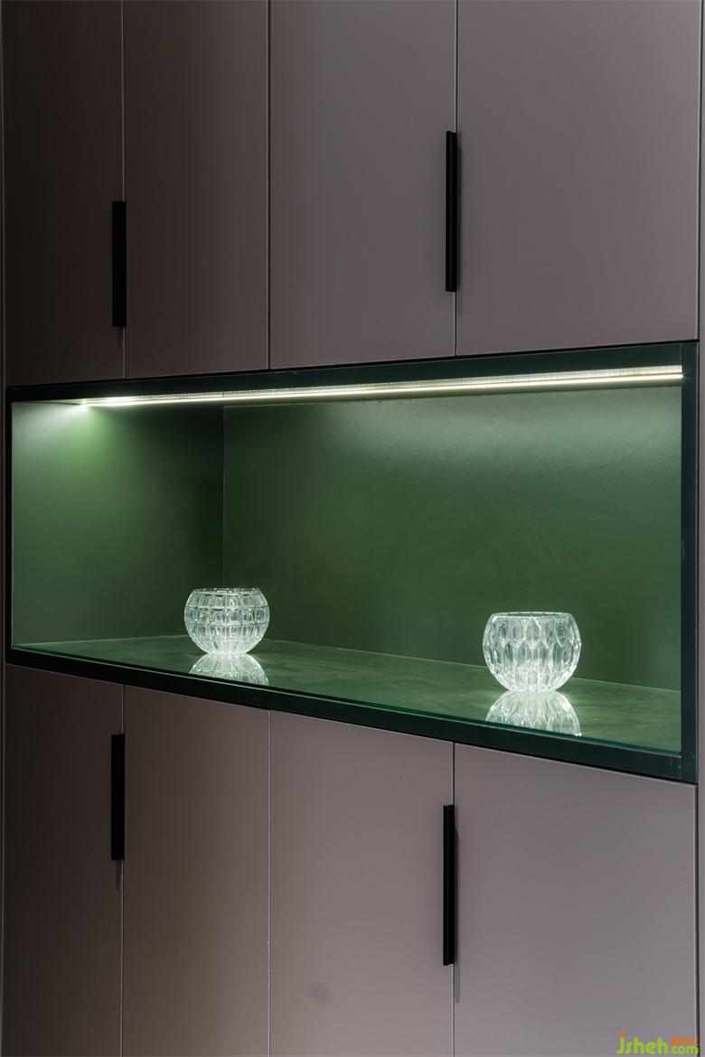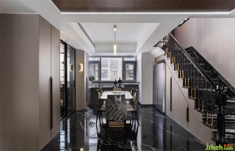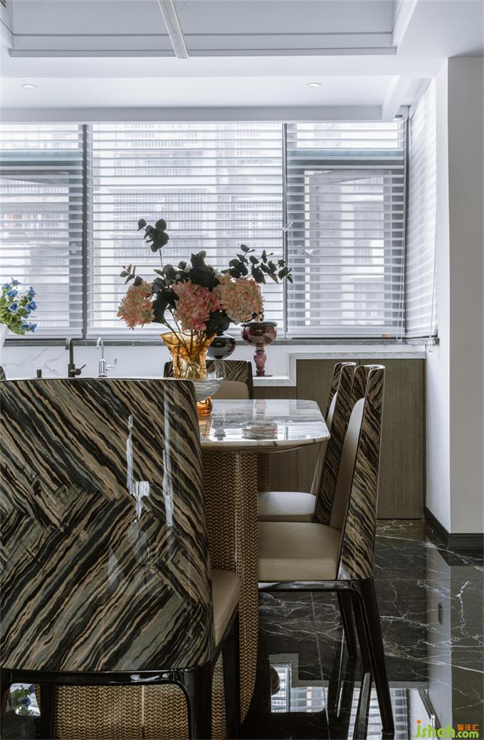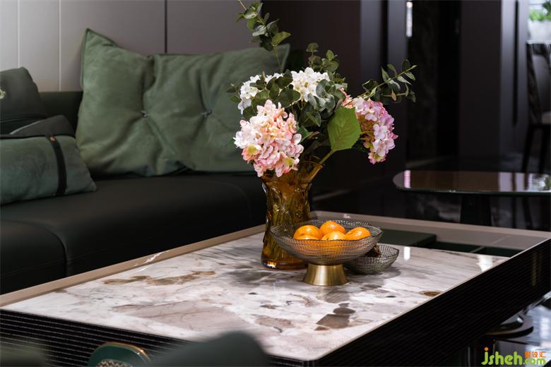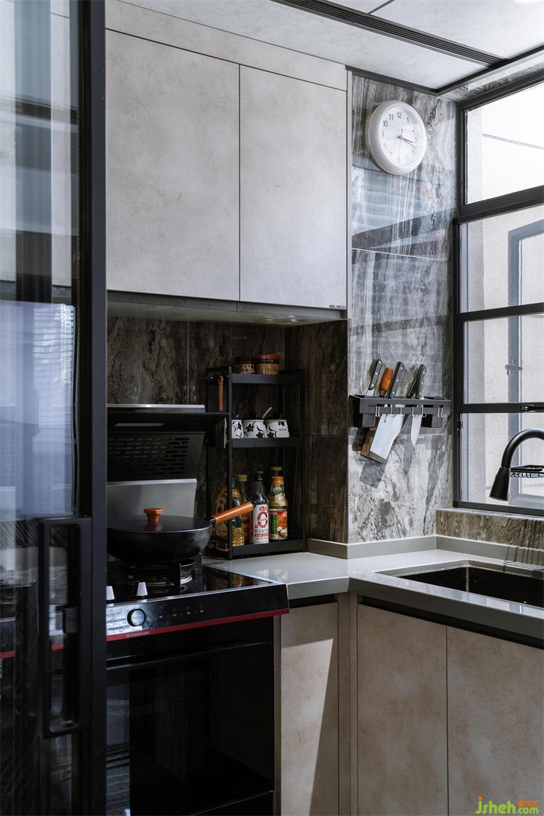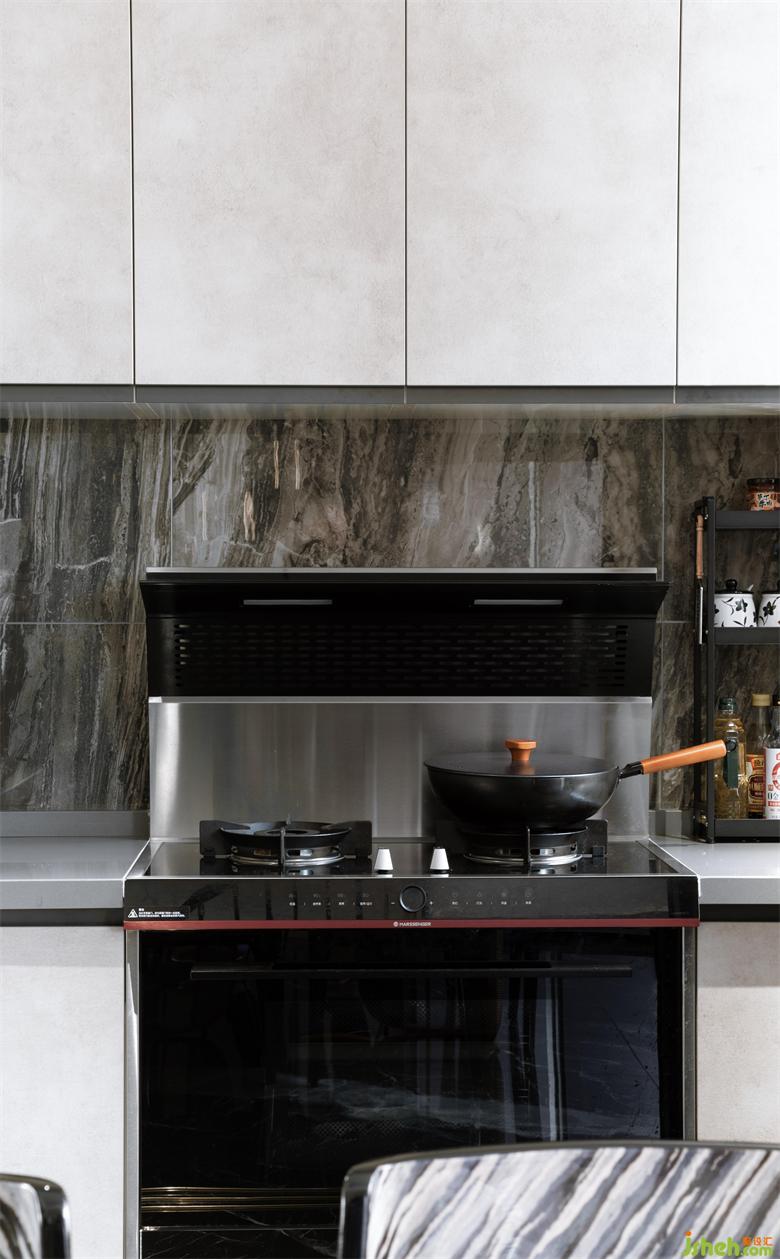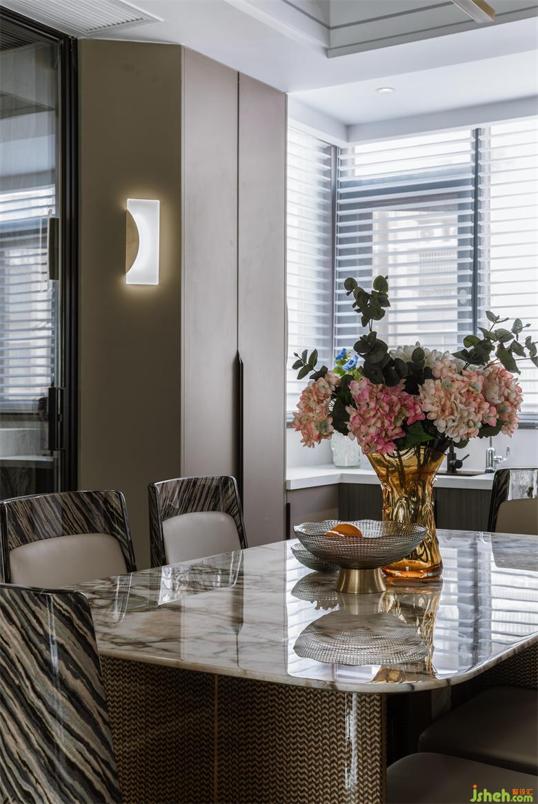 利用酒柜厚度弥补了餐厅与客厅抽线不水平,空间不方正的问题。斜角的设计让空间变得活泼,有处理。花园家居设计增加的操作台面大大提升了烹饪的时效。