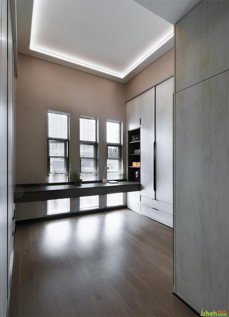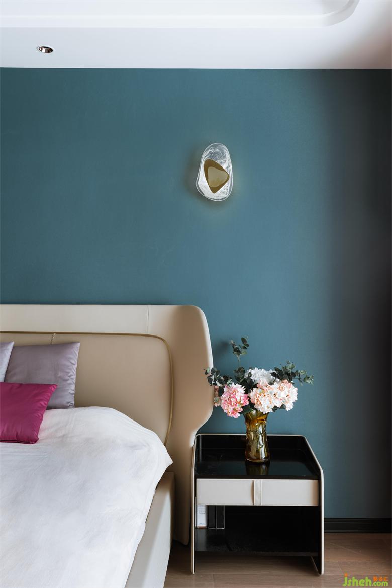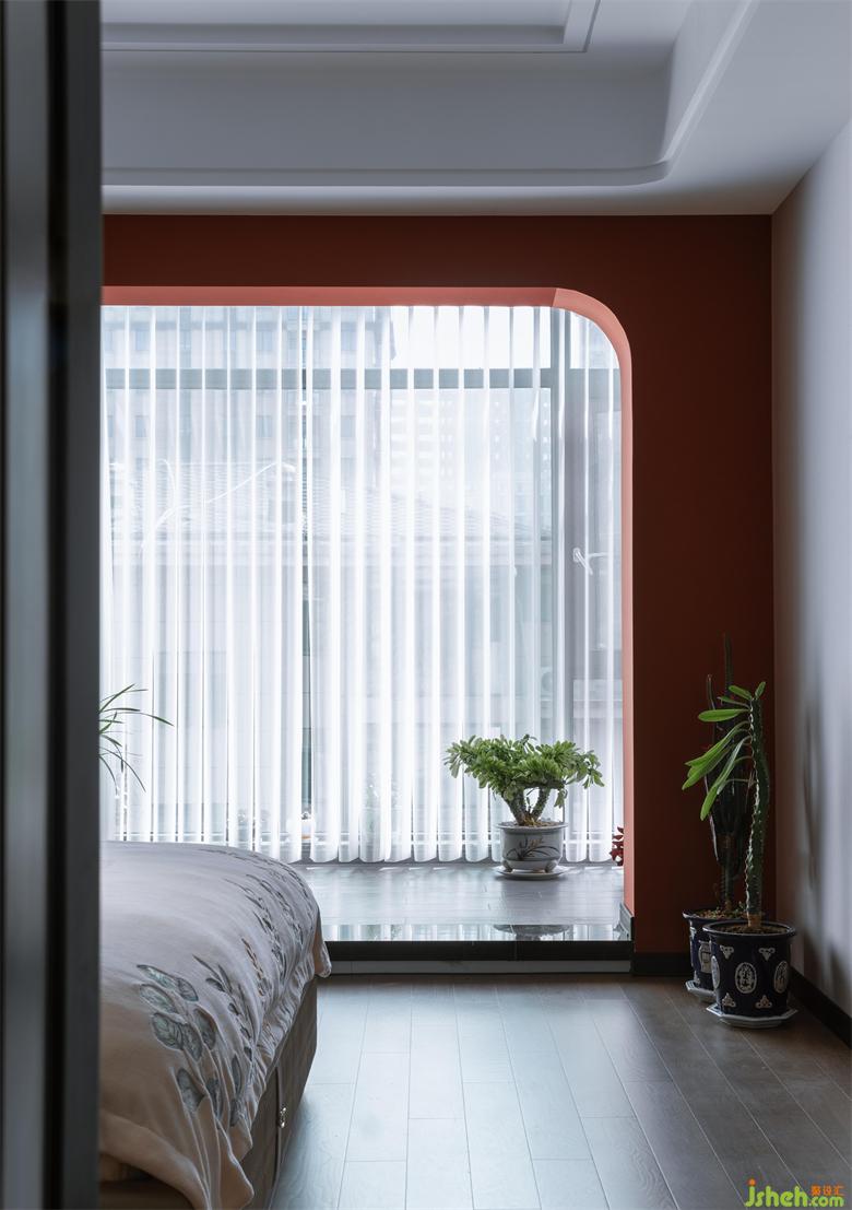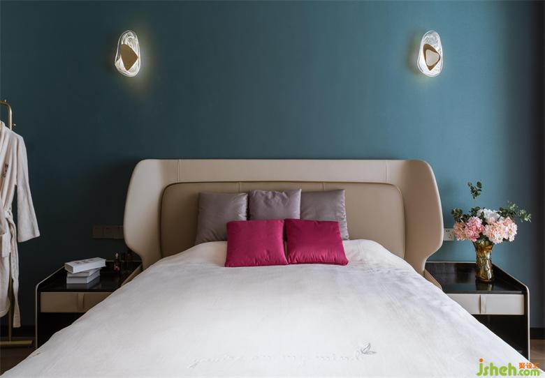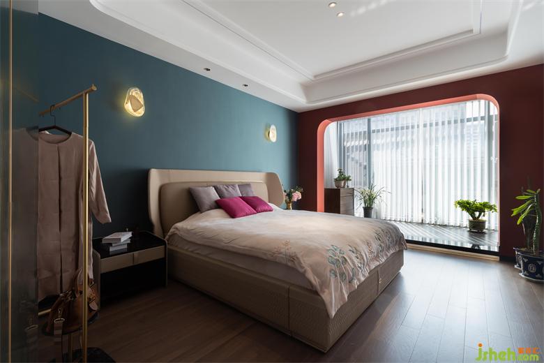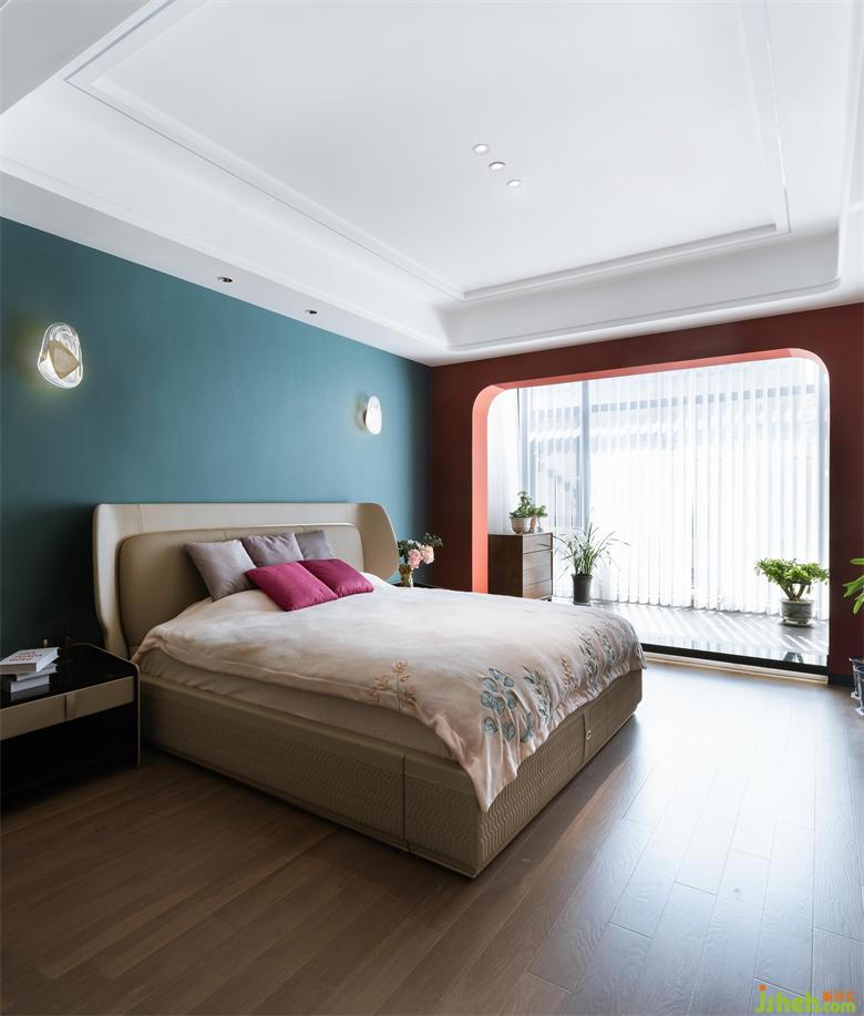 靛绿的床头搭配绯红色的弧形门廊,虽然色相不一样,但是冷暖一致,色调统一,足见设计师扎实的配色功底。花园家居设计为了丰富层次,预留了极致恰当的层高比例,使空间拥有奇妙的室内设计师氛围感。