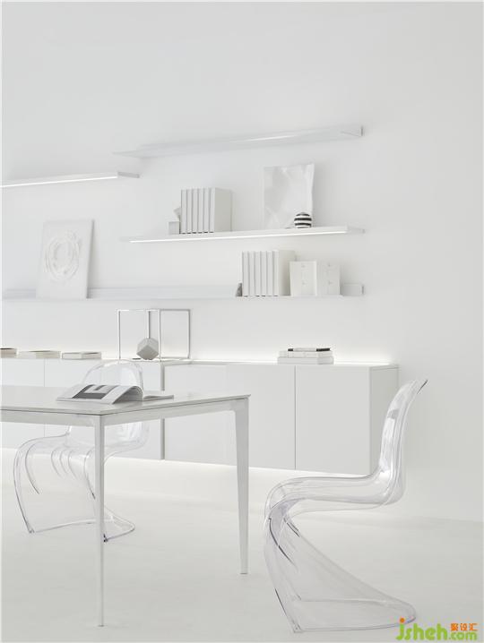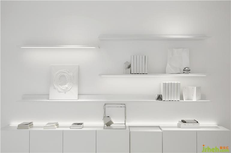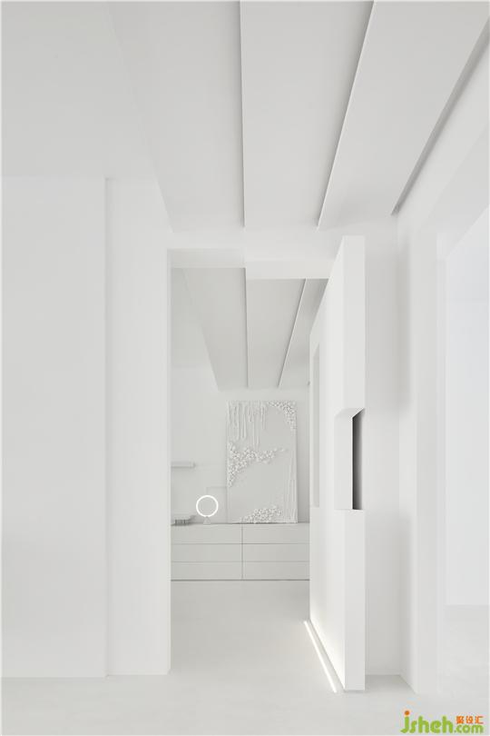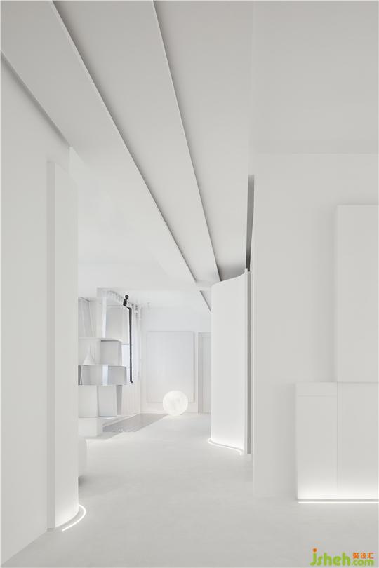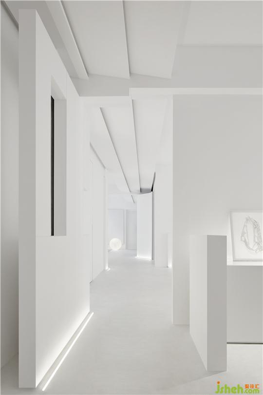 只在过道部分出现的吊顶,不仅隐藏了中央空调,造型上,办公室设计以三片式斜顶形式出现,结合灯光,以加强灰空间的导向性。这种出现在空间顶面、貌似“道路”的形式,喻义一种指向,即通向“平和”、“宁静”、“永恒”的心灵彼岸之路。