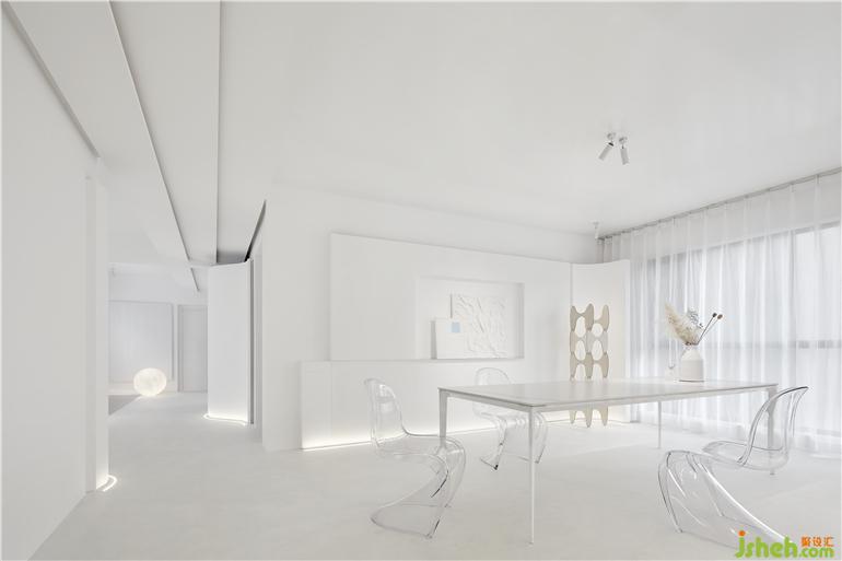 全屋大面积原始顶面做了反光漆处理,增加空间通透和光感的同时,模糊了空间天地的界限,意在指向我与无我的映射。