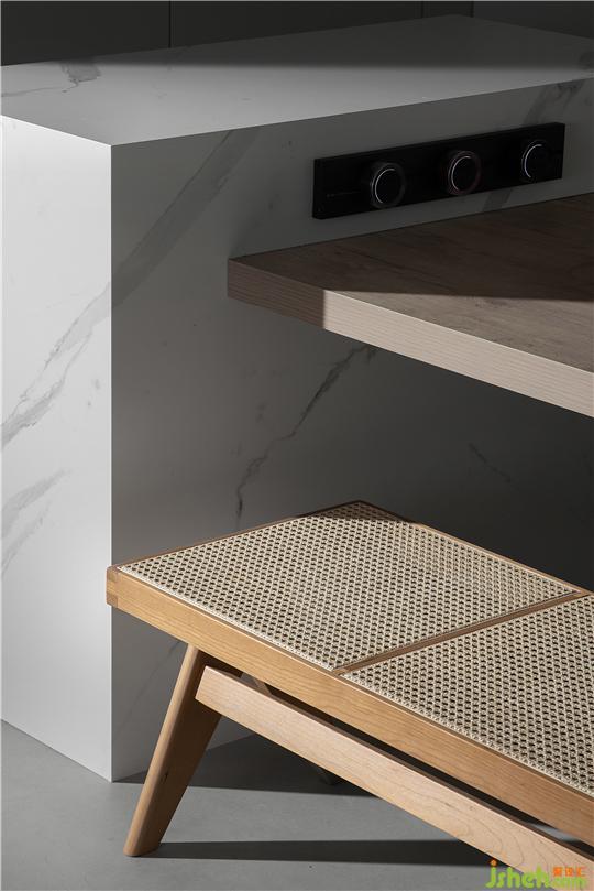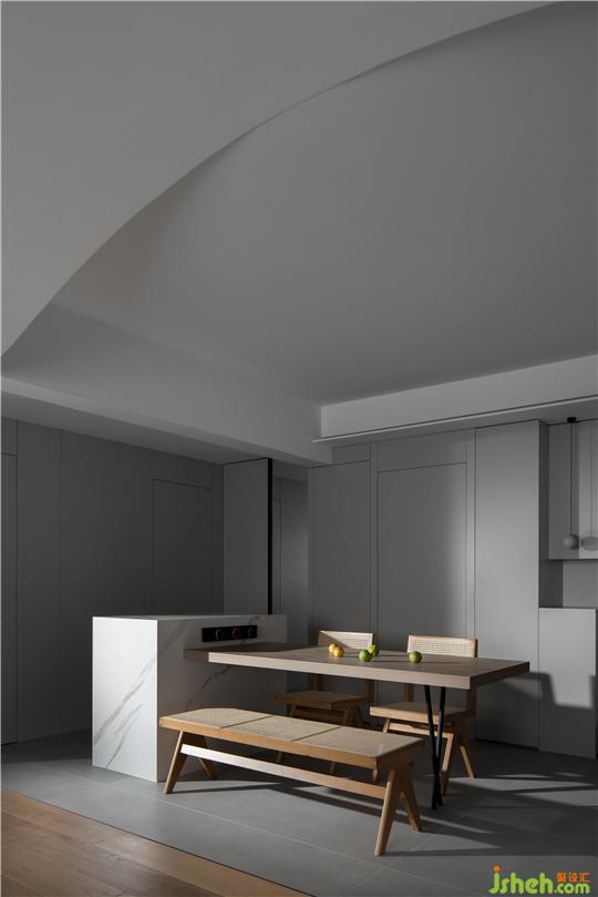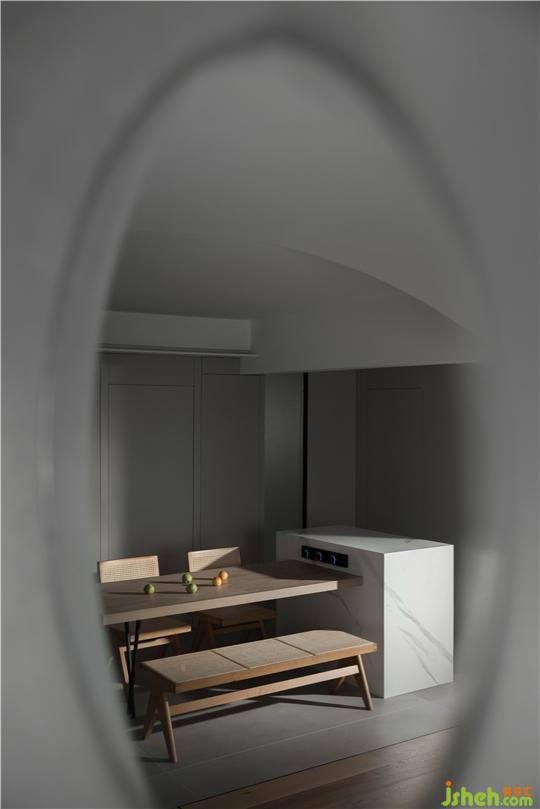 空间原始结构为两居室空间,客餐厅为长厅,洛阳装修设计在研究承重结构后,对原始结构进行了大面积的改造。由于客厅及阳台景色为洛河光景,我们就拆除了一个卧室与客餐厅打通,来增大采光和景观面。同时,考虑到业主一人居住,工作日均在单位就餐,只有周末偶尔做一些简餐,所以我们将中厨和卫生间缩小,增大公共空间面积,保留了一间大卧室;而在客厅区域,我们摒除常规会客沙发摆放形式,以地台结合坐垫靠包的灵活方式,满足不同场景下的生活格局;在靠阳台的部分,我们空出大量面积,凸显空间的开阔性,赋予空间无限可能:女主人可以健身、瑜伽、观影、看书,坐,卧,行,走,均可达到无拘无束的自由品质空间状态。