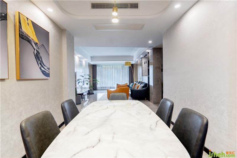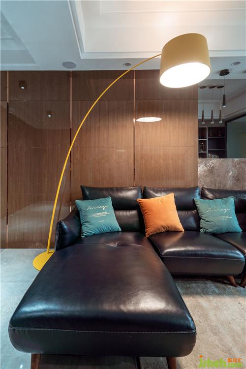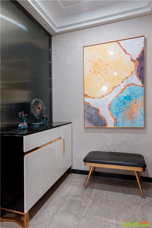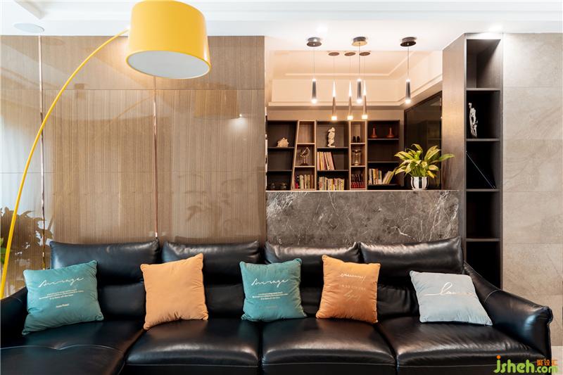 为了摒弃原有户型入户位置光线较弱的缺点,设计师把入户玄关后面那个卧室整体往外扩,在前端做一个敞开式书吧,让整个玄关亮起来,整体空间显得通透明亮。玄关通过过道的穿插有效的把餐厅和客厅分为一左一右,空间不失层次感。入户玄关采用灰色的长虹玻璃做屏风,敞开式书吧,书吧跟客厅之间有个高吧台,这样更加增加了整个空间的延伸,从而也拉大了客厅聚会的空间。