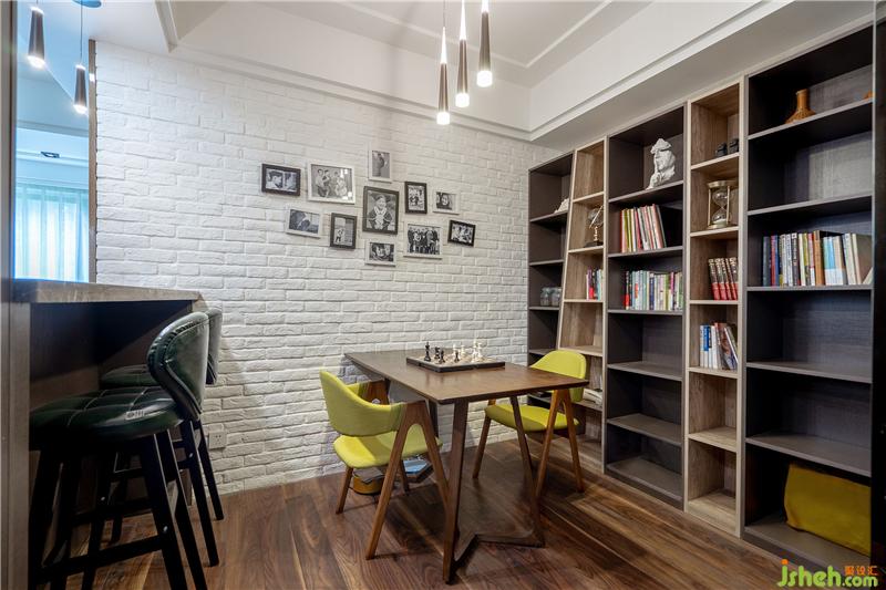 书吧的设计,既使整体空间达到了协调,又满足了业主要求,提供了原户型未能有的书房空间。给从事摄影工作的业主提供了办公空间,它既是办公室的延伸,又是家庭生活的一部分。墙面用白色文化石为背景,挂上黑白风格的照片,平时业主在这里陪小孩写作业,下国际象棋,朋友来了之后书房喝喝茶聊聊天,静享时光的美好。家装设计