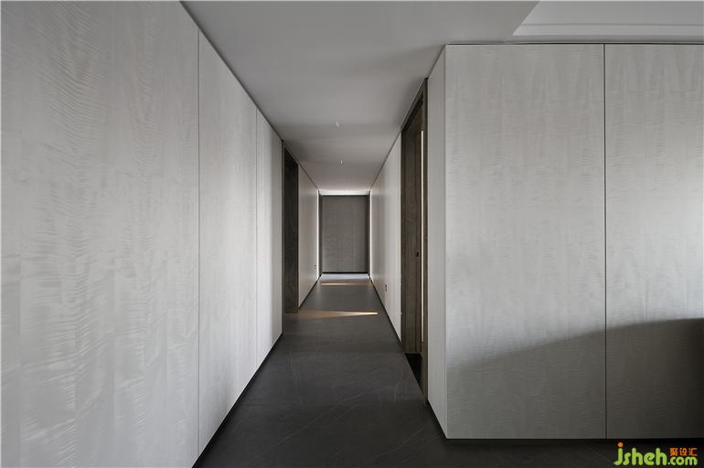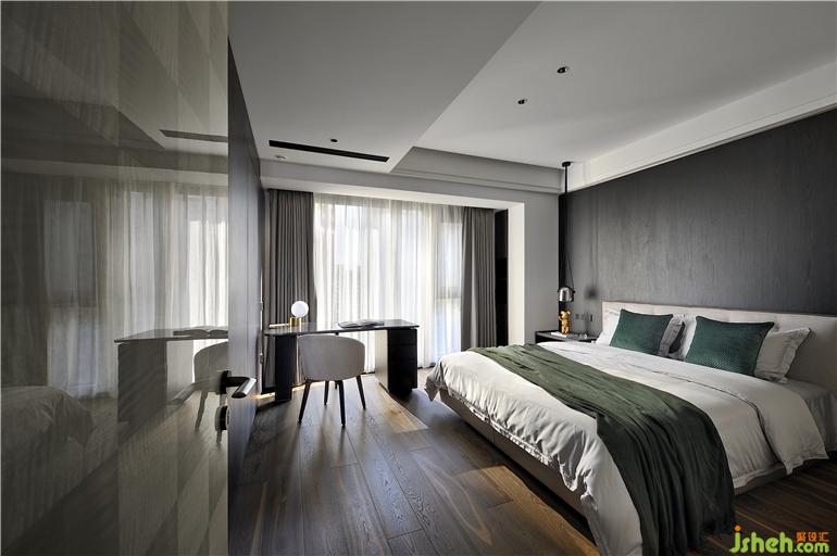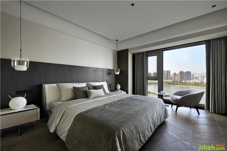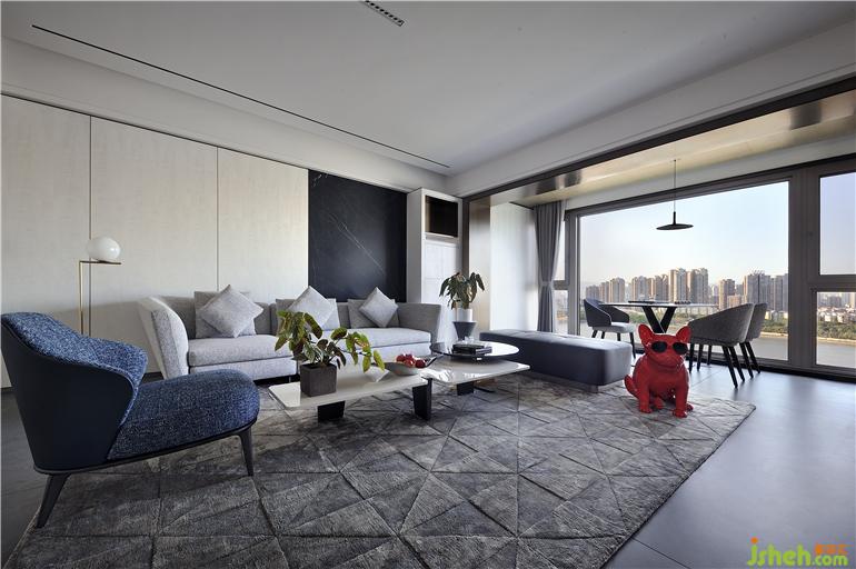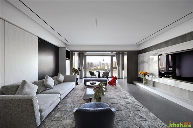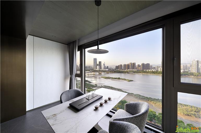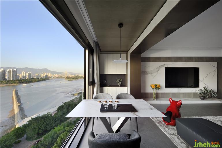 客厅,整面的落地窗强化室内外的互动,同时,通过借景营造空间与人的情感共鸣。色彩上,清浅的主色调构建起从容和缓的节奏,再以一抹蓝色提升空间的层次感、立体感,让空间绵延出治愈心灵的宁静与诗意。选材上,棉麻、大理石、墙板、黄铜等材质的布局、比例经过精密的计算,共同营造出丰盈的轻奢质感。