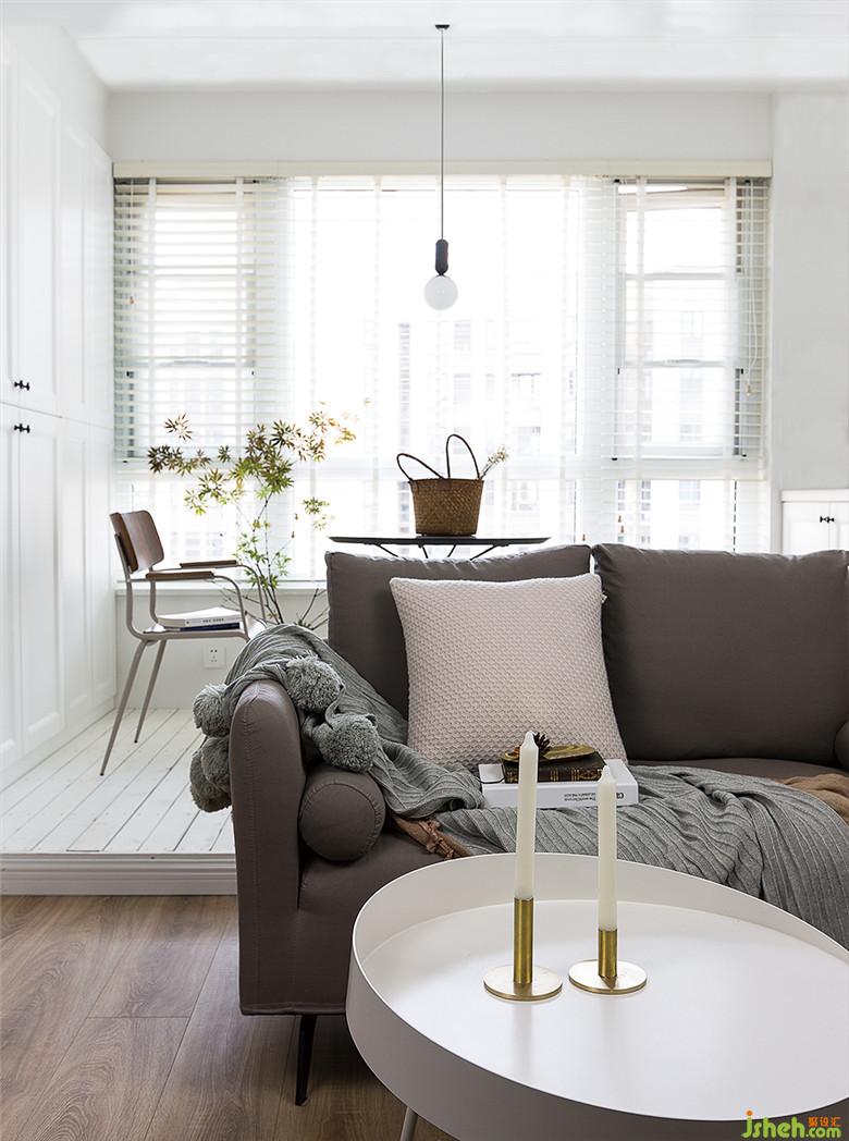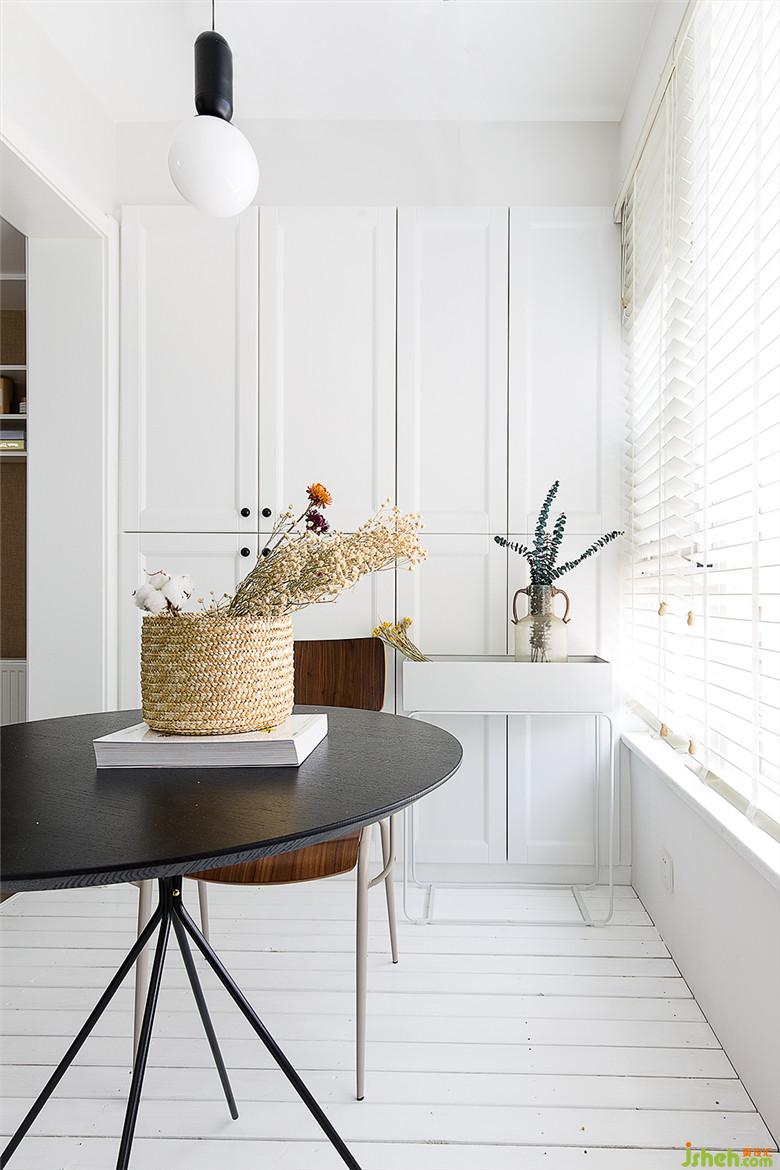将阳台与客厅连通,把更多的阳光洒进来。用白色的木头搭建了一个小地台,细细阅读,也可以在这里品尝刚出炉的甜点,白色的百叶窗,让光线有了更为丰富的层次。在纯净的白色空间里,木色和绿植更显平静的气质。