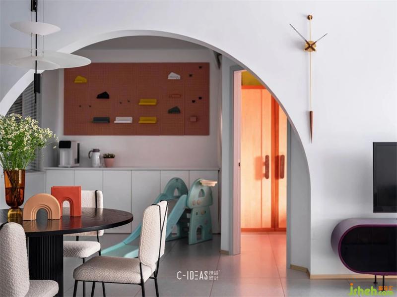 书房去掉一面墙,改成大圆弧洞口,一只可可爱爱的滑梯伸着大象鼻子在洞口里面探头探脑。墙面洞洞板可以随意DIY挂件,小书架是家中小宝贝最喜欢的角落。