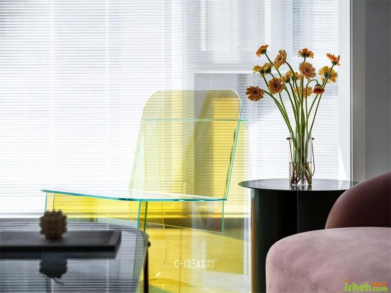 黄色半透明亚克力单椅,灰绿色金属小茶几,灰色地砖,粉色勾缝,几朵非洲菊,满室阳光。闲适生活,悠哉悠哉。