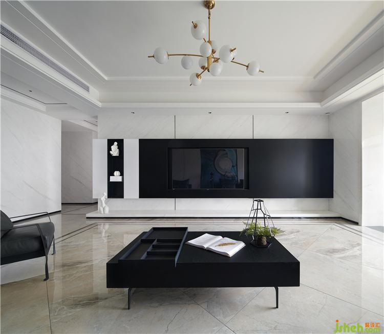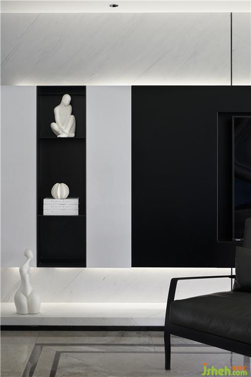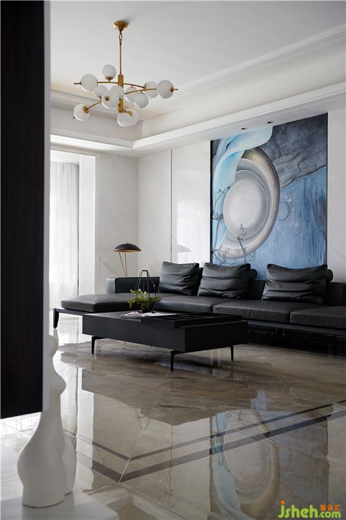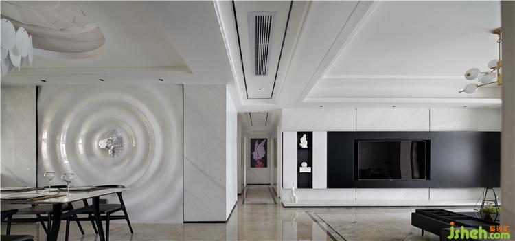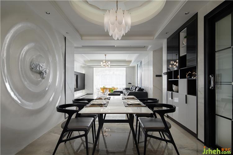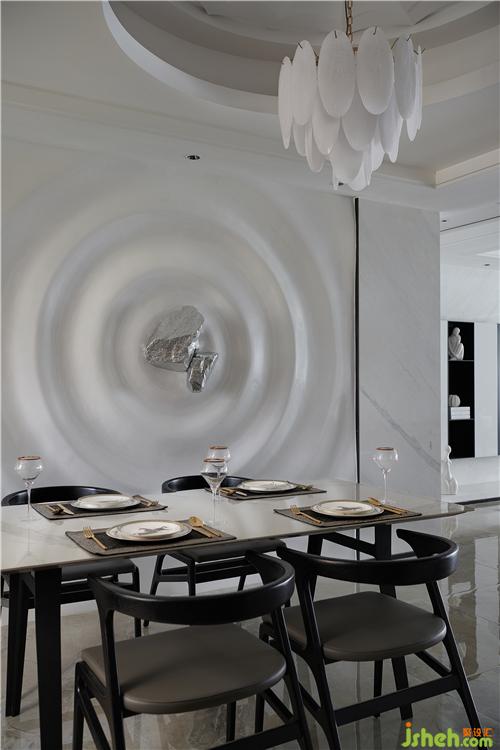 黑白灰的空间有着深邃的视觉延伸感,沙发背后精心挑选的手绘缀饰……色调柔和的背景铺陈开来,在简洁的黑白灰空间里,显得份外恣意洒脱……餐厅的白色雕塑背景,若晕染开的水波,星光连绵,点缀着星夜,光芒围绕……又似少女的螺髻,立体生动。光影缠绕间,交错的线条刻画着生活的丰富多变,同时中和了日常柴木油盐的寡淡。不同的材质在空间中相遇,奏着和而不同的生活乐章。