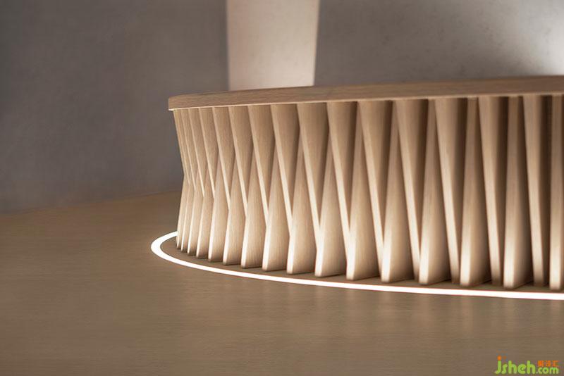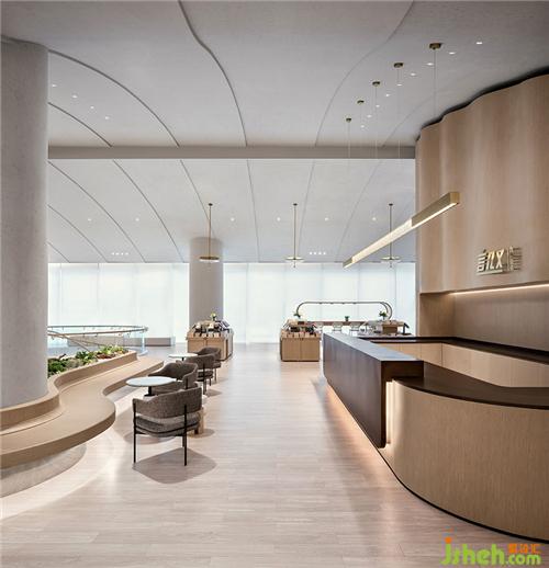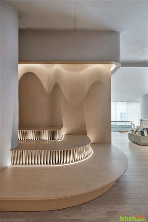 设计充分发挥空间层高优势,以挑空架构为主,天花打造成山形走势,叠加的曲面置入灯带以打造自然光源的效果,狭长的落地窗、落入室内的自然光成为空间体验亮点。