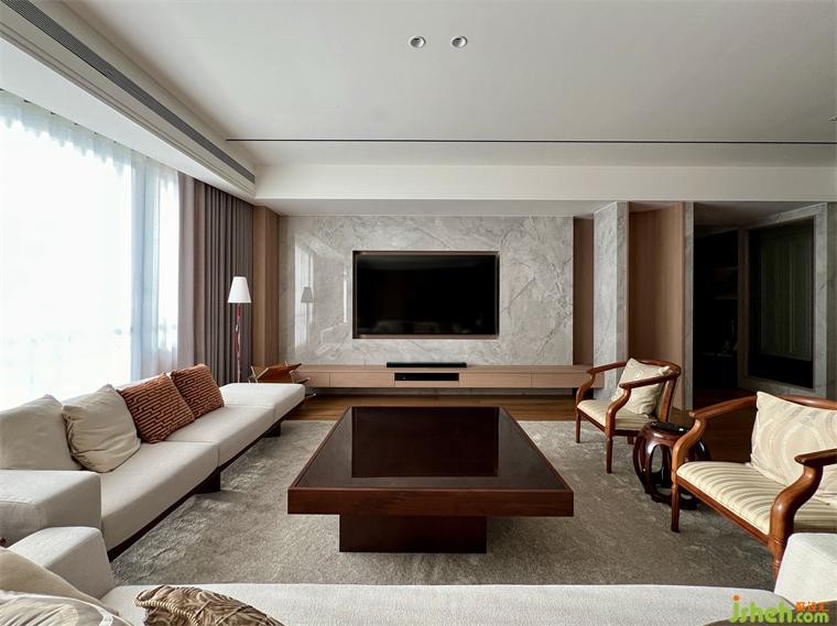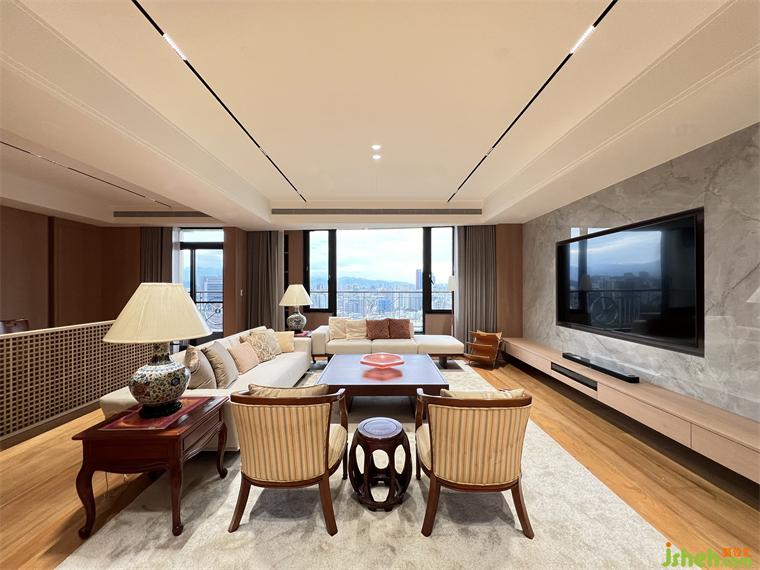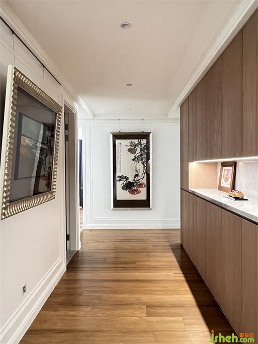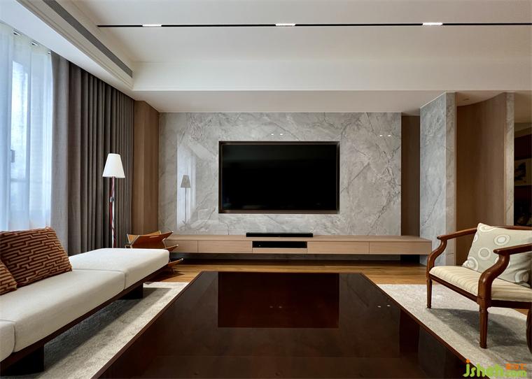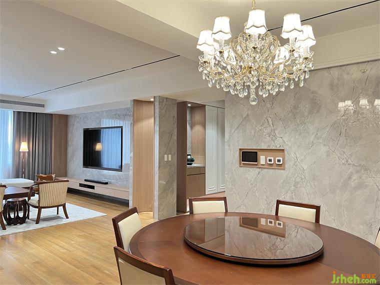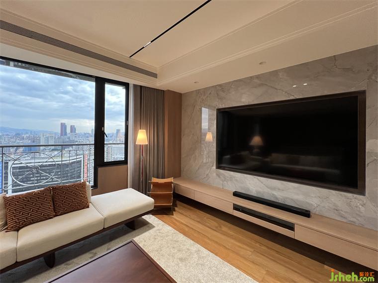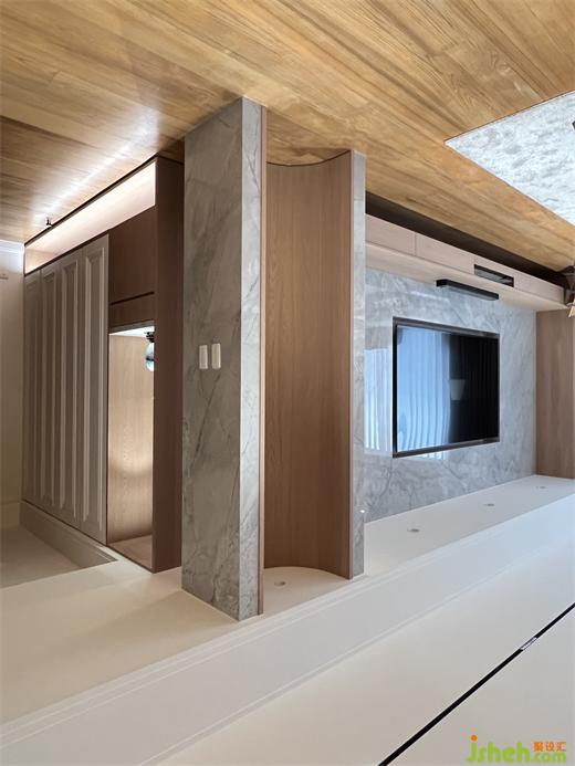 本案面积为230平方米的电梯平层住宅,位于市中心精华地段,拥有绝佳的视野及采光,豪宅设计原有的平面格局,空间尺度较琐碎,动在线不够连贯,因此浪费了一些过道空间,在全面拆除重新规划后,从大门入口处,将原本庞大的机电箱改小,并重新规划墙面的机能,将机电设备.外穿挂衣区.内.外穿鞋收纳区及端景区,有效的整合在每一处空间,并运用木皮.喷漆及大板砖等立面材料,将玄关区墙面至客厅电视主墙面结合在一起。