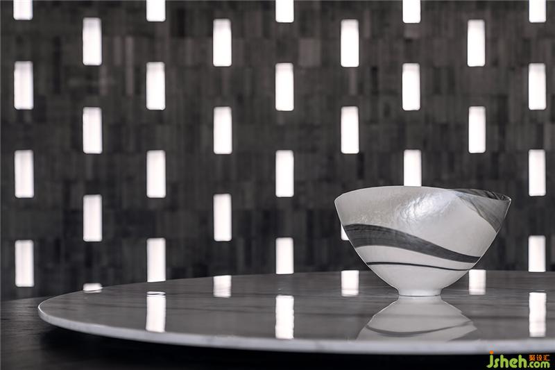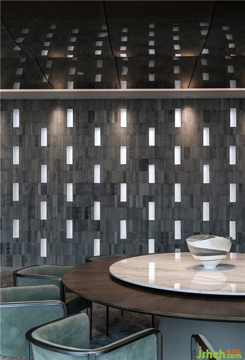 外立面镂空的造型能让光线进到室内,如何引入光线也是思考的方向,砖的概念通过虚实的表达方式,青砖与玻璃砖的搭配,让光有节制的穿透,营造戏剧性的光影氛围。这是建筑与室内的一种交互,白天室外赋予室内效果,晚上室内赋予建筑光影。